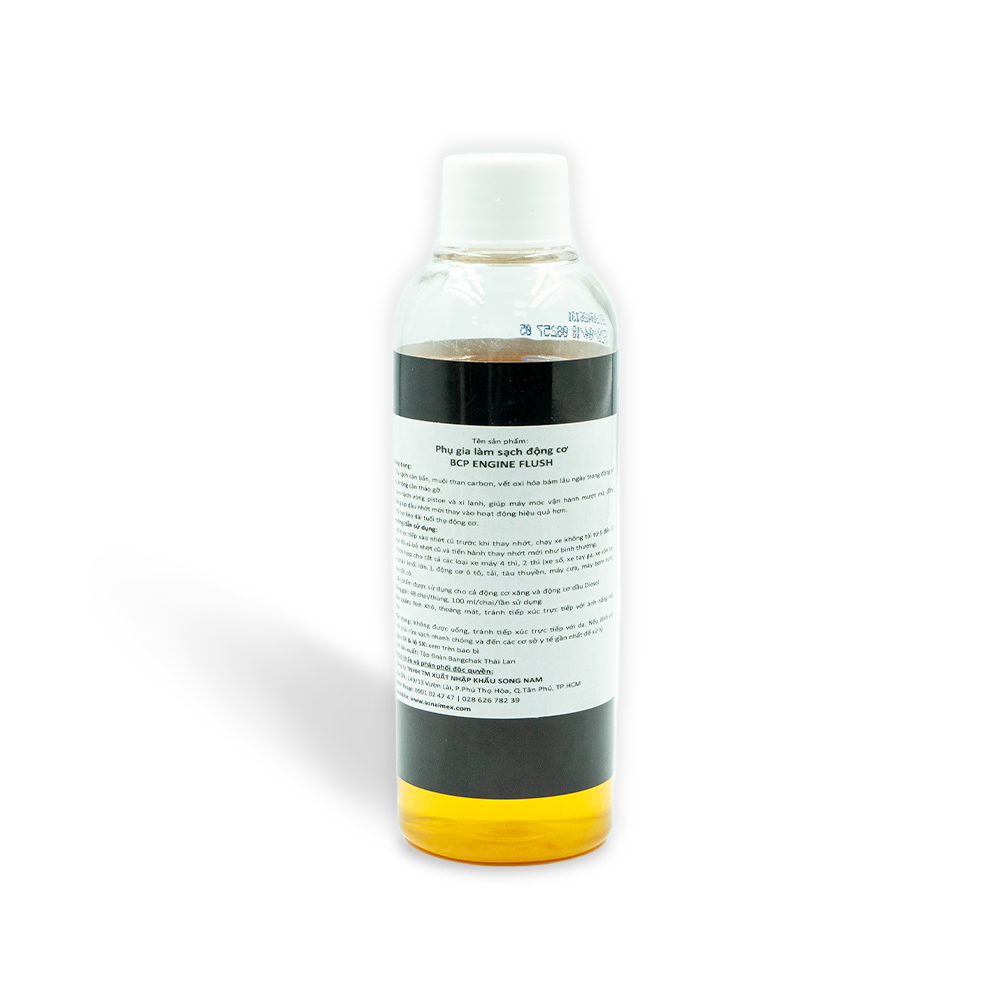 • Hỗ trợ kéo dài tuổi thọ động cơ. Đóng gói 100ml/ chai 48 chai / thùng   Khuyến nghị sử dụng   Sản phẩm sử dụng được cho tất cả các dòng xe máy 4 thì, 2 thì ( xe số, xe tay ga, xe tay côn, xe phân khối lơn ), động cơ ô tô, xe tải, tàu thuyền, máy cưa, máy cắt cỏ... Hướng dẫn sử dụng Đổ 1 chai súc động cơ Engine Flush 100ml trực tiếp vào tối đa 1.2 lít nhớt cũ trước khi thay nhớt, chạy xe không tải từ 5-10 phút rồi xả bỏ nhớt cũ và tiến hành thay nhớt mới như bình thường.   Thời gian sử dụng lại sản phẩm Sử dụng thường xuyên sau mỗi 5.000 - 6.000km để giữ động cơ luôn sạch. Sản phẩm dùng được cho cả động cơ xăng và động cơ dầu Diesel.   Sản phẩm mang thương hiệu BCP do Tập Đoàn Năng Lượng Bangchak hàng đầu của Thái Lan sản xuất và nhập khẩu trực tiếp về Việt Nam bởi SONAIMEX.