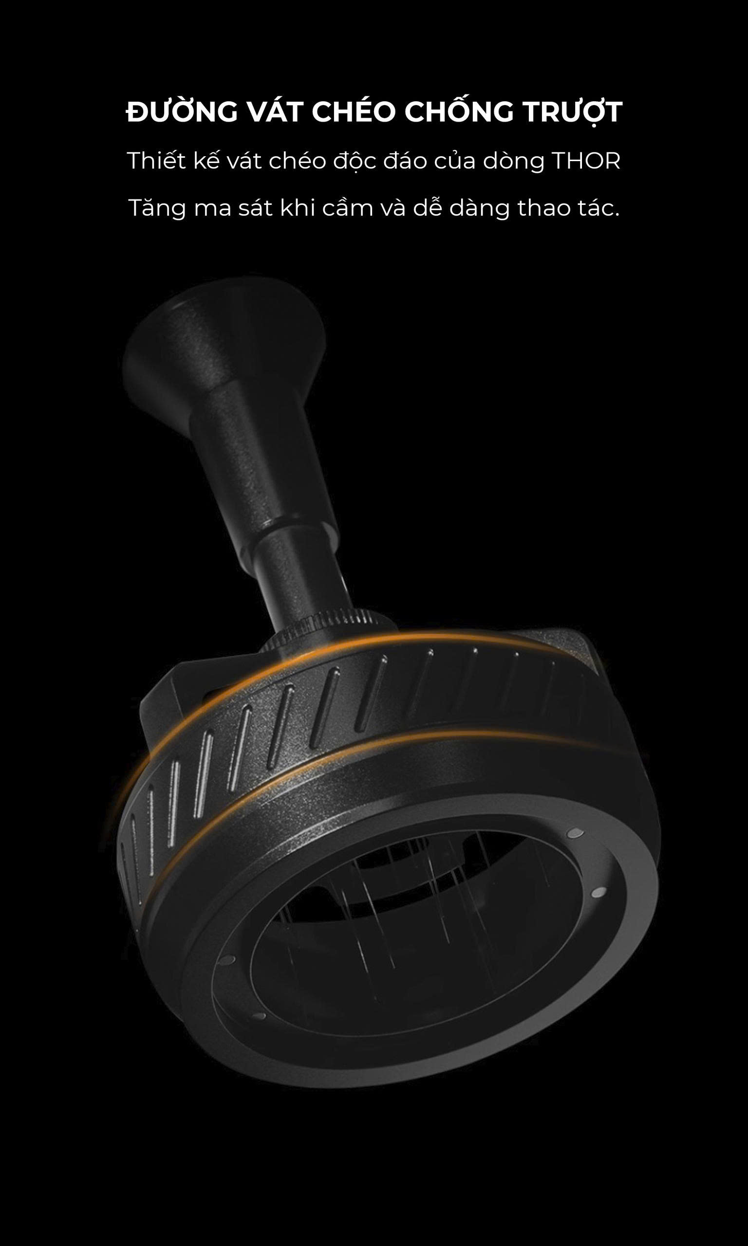 - Tamper lực cố định THOR • Nén thẳng 90° – Chuẩn lực – Có phản hồi âm thanh • Tự động bật lại sau khi nén xong • Không cần kỹ thuật, ai cũng nén đẹp như barista