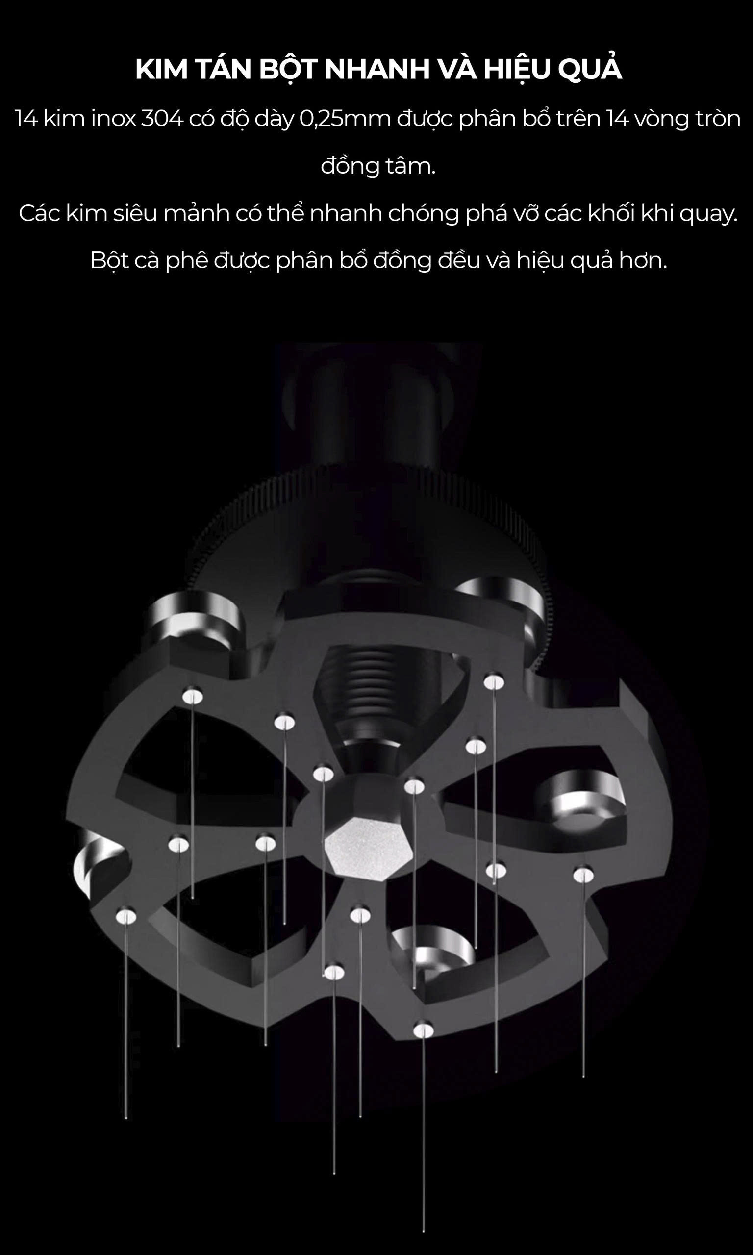 - Kim xoay tán đều bột THOR • Xoắn ốc đều tay – đĩa kim quay tròn khi ấn • Phân bổ bột đồng đều, không vón cục