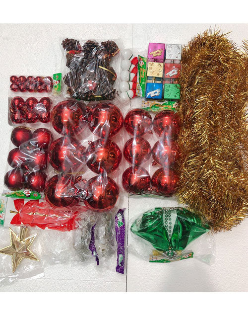 12 Trái châu bóng 10 cm 12 Trái châu bóng 8 cm 12 Trái châu bóng 6 cm 12 Trái châu bóng 4 cm 20 Trái châu bóng 2.5cm 2 túi hộp quà nhỏ 6 hộp quà lớn 2 túi bông tuyết vừa 4 Nơ nhung số 1 2 bịch nơ lớn 6 cuộn đèn chớp 8 dây kim tuyến 1 ngôi sao đỉnh có đèn 1 Chuông Chiếc 100 1 Túi Thông 1 Túi Ông già tuyết nhỏ