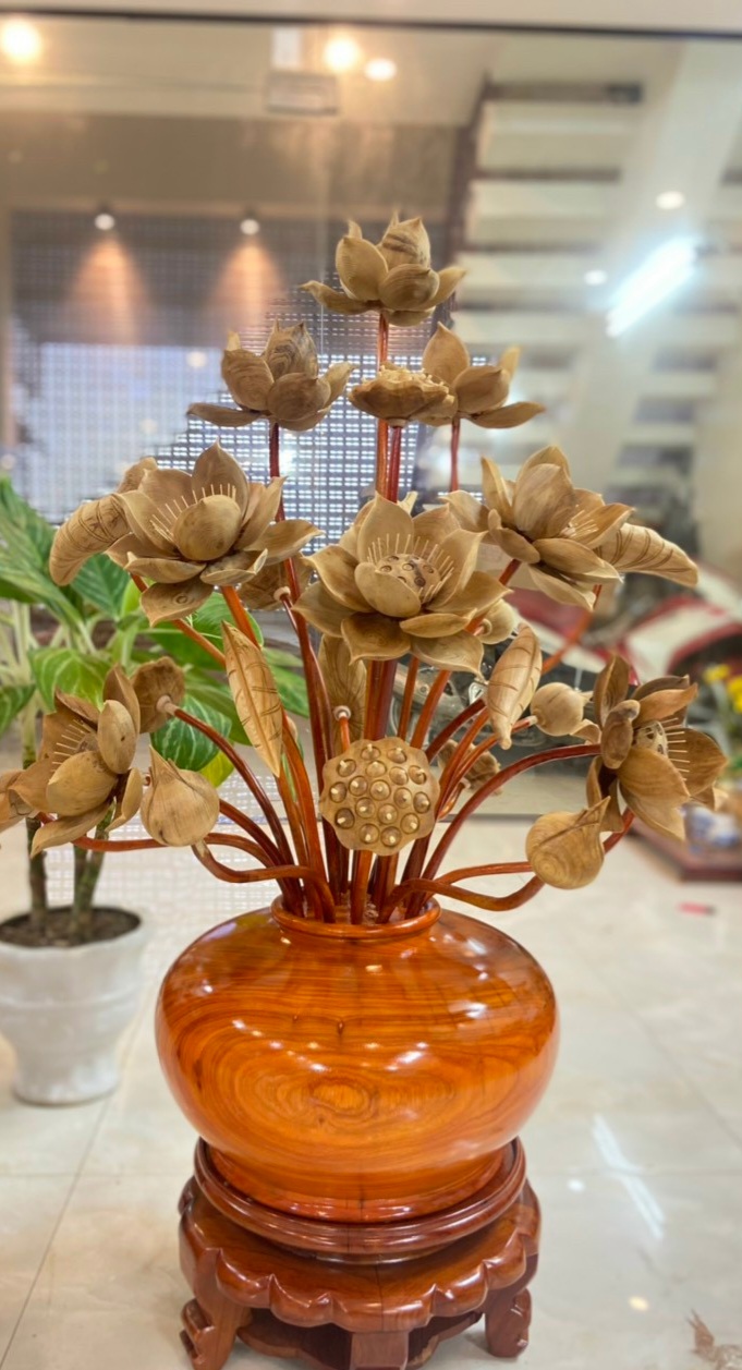 _ 1 bình hoa sen trang trí phòng khách phòng thờ được làm bằng chất liệu gỗ hương đỏ tự nhiên 100% _ Kt bình cắm cao 25×23cm +kt cao tổng hoa lá gương 82cm