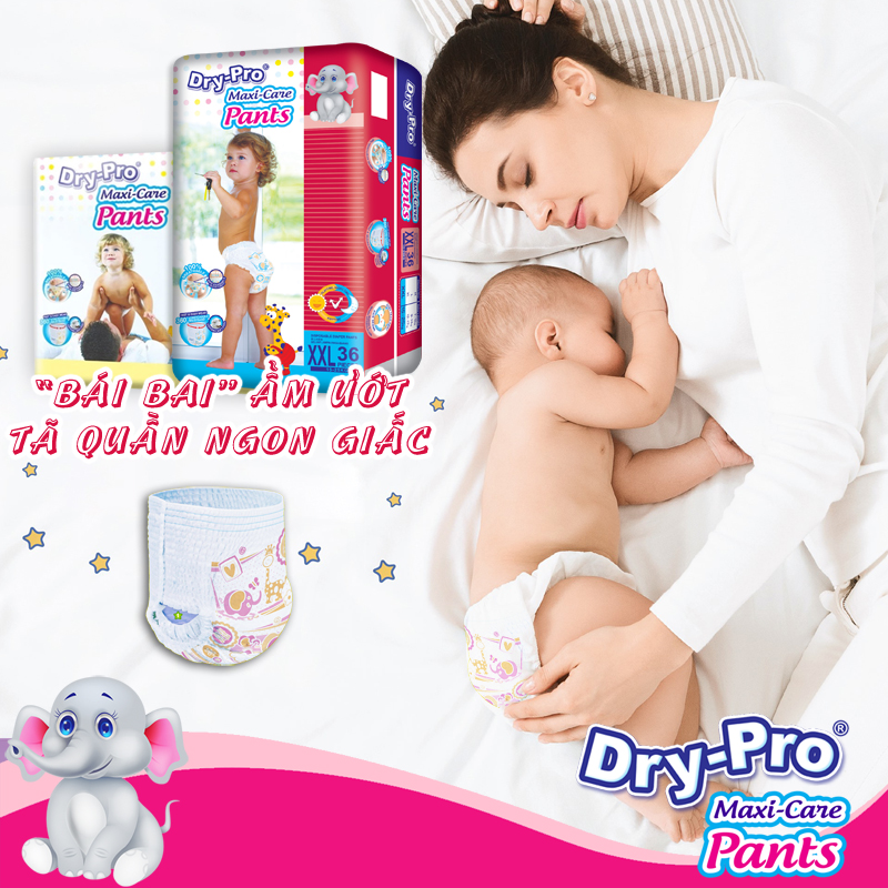 Tã quần Dry-Pro đã và đang trở thành một trong những sự lựa chọn ưu tiên của các bà mẹ Việt bởi những ưu điểm hết sức vượt trội sau: 1.Lõi siêu thấm hút với bề mặt phân bổ chất lỏng FDL hiệu quả 2.Lưng thun co giãn 360 độ giúp mẹ mặc cho bé nhanh và dễ dàng, bé luôn thoải mái vận động cả ngày và ngủ êm ái suốt đêm. 3.Rãnh đứng 2 biên bảo vệ chống tràn, ngăn chất lỏng rò rỉ ra ngoài. 4.Lớp bông 100% cotton mềm mại, thoáng khí, nhẹ nhàng với làn da nhạy cảm của bé. 5.Đây là sản phẩm mới, đã được cải tiến về bao bì và chất lượng, mẹ mua ngay cho bé để dùng thử và cảm nhận nhé!   Nghiên cứu thị trường và đặc điểm trẻ em châu Á, nhà sản xuất Dry-Pro cung cấp cho người dùng rất nhiều loại bỉm khác nhau phù hợp với độ tuổi, cân nặng và cơ địa bé: -Bỉm quần size M: thấm hút 350ml nước -Bỉm quần size L: thấm hút 520ml nước -Bỉm quần size XL: thấm hút 550ml nước -Bỉm quần size XXL: thấm hút 600ml nước     Cách chọn size tã quần Dry-Pro cho bé: -Size M: cho bé từ 7-12 ký -Size L: cho bé từ 9-14 ký -Size XL: cho bé từ 12-17 ký -Size XXL: cho bé từ 15-25 ký     Dry-Pro có dòng tã quần Maxi-Care và tã dán Ultra-Soft, mẹ xem bảng quy đổi sau để kết hợp chọn loại tã phù hợp cho hoạt động cả ngày của bé sao cho bé luôn thoải mái mà lại tiết kiệm (ví dụ mẹ có thể dùng tã quần lúc ban ngày và tã dán trong lúc bé ngủ)             Lưu ý: -Tránh xa tầm tay trẻ em, bao bì tã bằng nhựa và tã quần trẻ em có thể gây ngạt thở, không vứt tã đã sử dụng vào bồn cầu -Để tránh kích ứng da, lau mông cho bé sạch và khô Bảo quản: Nơi khô ráo, thoáng mát, tránh để gần lửa và nơi có nhiệt độ cao.         Thông tin thương hiệu: Dry-Pro là thương hiệu tã bỉm em bé chất lượng cao với giá thành hợp lý được ưa chuộng tại thị trường Malaysia và các nước khác trên 19 năm. Dry-Pro đảm bảo đem đến sự chăm sóc chuyên nghiệp cho trẻ sơ sinh và trẻ nhỏ trên khắp thế giới với nhiều loại tã bỉm đa dạng.