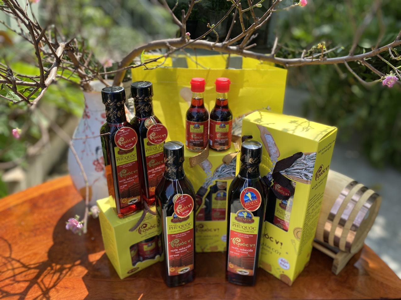 Combo Tết 3 Hộp Vàng Nước Mắm Cốt Phú Quốc - Quốc Vị Độ Đạm 40N Chai Thủy Tinh 520ml, 250ml, 60ml Cá Cơm