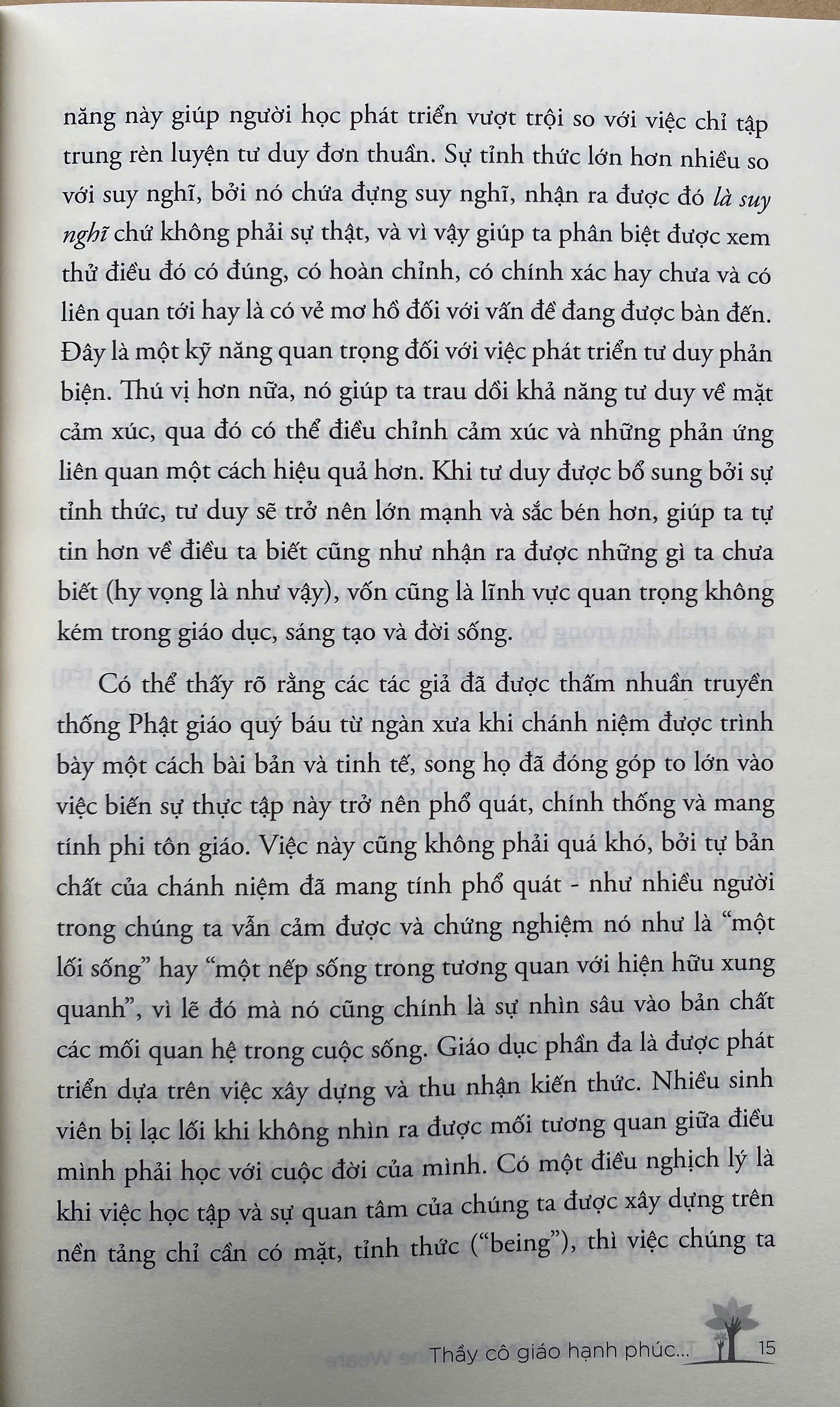 “Thầy cô giáo hạnh phúc sẽ thay đổi thế giới” - bộ sách bạn đang cầm trên tay là một món quà đặc biệt quan trọng - hay nói cách khác là một sự trao truyền - từ Thiền sư Thích Nhất Hạnh trao tặng vào giai đoạn chín muồi của một nhân cách vĩ đại. Bạn sẽ thấy rằng nó là kết tinh tình thương sâu sắc của Thiền sư đối với những người trẻ và sự mong mỏi không ngừng về một nền giáo dục bồi dưỡng tài và đức cho các thế hệ mai sau. Ở mỗi trang, bạn có thể cảm được sự tôn vinh dành cho những con người đang thực hiện sứ mệnh này, thường là âm thầm không ai biết, và khối lượng công việc khổng lồ mà họ gánh vác từng ngày nhằm phục vụ cho công cuộc kiến tạo, chuyển hóa và hàn gắn thế giới của chúng ta từ dưới lên, từ thế hệ này sang thế hệ khác - đó là những người thầy, người cô. Đây cũng đồng thời là tác phẩm được kết tinh từ sự cộng tác đầy cảm hứng với giáo sư Katherine Weare, một nhà giáo dục và cũng là một giáo viên về chánh niệm, người đã có nhiều năm nghiên cứu những tác động của thực tập chánh niệm trong môi trường học đường, và đội ngũ các cây bút cố vấn, những học trò lớn của Thiền sư từ Làng Mai. Cùng nhau họ đã thiết kế một cẩm nang thiền tập mang tính đa diện và rất dễ sử dụng để giúp các thầy cô giáo có thể đem chánh niệm vào lớp học cũng như vào đời sống của chính mình bằng nhiều hình thức. Bộ sách gồm 2 cuốn: Tập 1 “Cẩm nang hạnh phúc”, tập 2 “Đi như một dòng sông” Trong cuốn “Cẩm nang hạnh phúc” thầy Thích Nhất Hạnh và tác giả Katherine Weare sẽ chia sẻ chi tiết về chánh niệm và tỉnh thức. Bởi thế giới đang thay đổi quá nhanh đến nỗi chúng ta không thực sự biết được nền tảng tri thức và kỹ năng nào sẽ là quan trọng nhất mà các thế hệ kế cận cần phải trau dồi. Nhưng điều mà chúng ta có thể biết chắc là muốn sáng tạo, yêu nghề, thích nghi với thời đại kỹ thuật số và học hỏi suốt đời thì người trẻ ở lứa tuổi nào cũng cần phải phát triển kỹ năng sống với giây phút hiện tại. Điều này bao gồm kỹ năng làm bạn với chính mình, tin tưởng những trải nghiệm trong nội tâm và học cách làm chủ môi trường bên trong, gồm thân và tâm của mình, cũng như biết cách thích nghi với môi trường học tập bên ngoài khi tương tác với những người khác. Đánh thức khả năng sáng tạo và trí tưởng tượng của bản thân trong suốt cuộc đời theo cách thức này là một yếu tố quan trọng dẫn tới thành công và hạnh phúc như tiêu đề của  bộ sách. Một trong những nguyên tắc chính ở đây là các thầy cô giáo cần thực tập chánh niệm trong đời sống của chính mình trước khi có thể đưa nó vào lớp học một cách hiệu quả. Nếu bạn làm nghề giáo và mới biết đến phương pháp chánh niệm, bộ sách này sẽ hướng dẫn hết sức chi tiết cách bạn thực tập cho chính mình, cũng như cách bạn có thể đưa nó vào lớp học theo cách riêng của mình để giúp học sinh phát triển lành mạnh về thể chất và tinh thần, biết cách chăm sóc cảm xúc và có niềm vui trong khi học. Cần lưu ý rằng không có một phương pháp nào là phù hợp cho mọi hoàn cảnh. Cái hay của cách nhìn này là cho bạn một loạt các lựa chọn để thử nghiệm và trên hết là nhắc bạn nhớ rằng chính sự sáng tạo của riêng bạn, được nuôi dưỡng bởi sự thực tập chánh niệm, sẽ mang đến muôn vàn những cơ hội mới và đầy thú vị. Nói một cách thực tế thì học trò của bạn sẽ là người giúp khơi mở nguồn tuệ giác đó trong bạn. Các em chính là những người thầy chánh niệm vĩ đại nhất của bạn. Điểm hay của phương thức tiếp cận này là nó có thể bắt nguồn từ tình yêu nghề và tấm lòng mong mỏi học trò tiến bộ, được ấp ủ và truyền đạt bởi chính trực giác và kinh nghiệm thực tiễn của bạn; tất cả những điều này đều dựa vào công phu thực tập trong từng thời khắc của bạn. Theo như tôi nghiệm thấy, những băn khoăn, học hỏi, quán chiếu cứ lớn lên không ngừng trên mảnh đất nuôi dưỡng ấy.