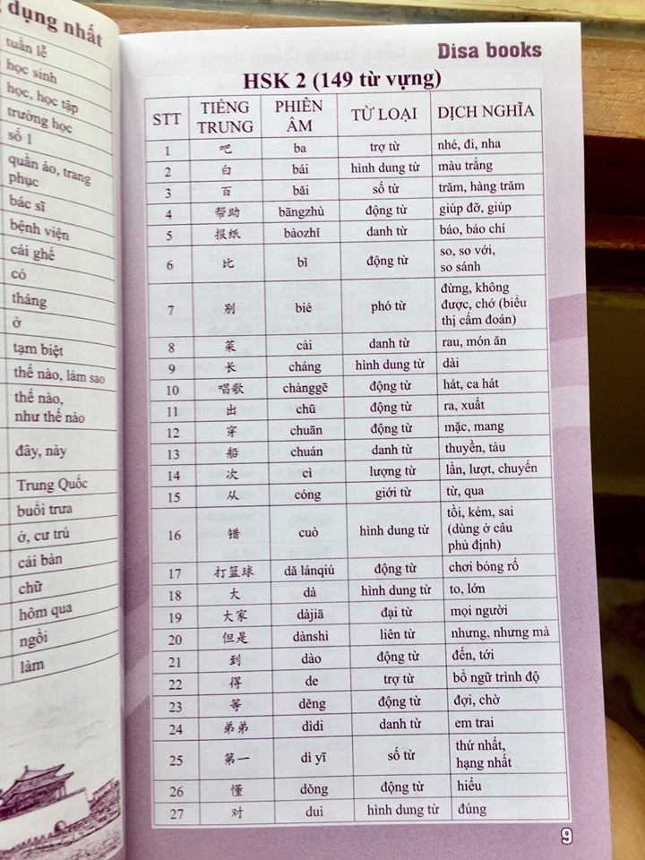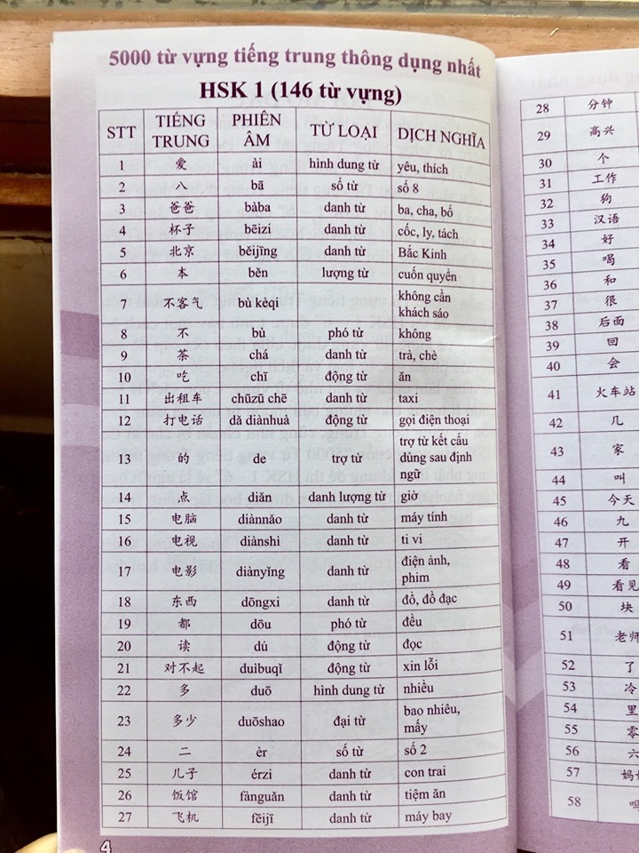 2.5000 từ vựng tiếng Trung thông dụng nhất Nội dung sách: “Sách – 5000 từ vựng tiếng Trung thông dụng nhất” theo khung đề thi từ HSK1 – 6 cung cấp đầy đủ lượng từ vựng cần thiết giúp việc học từ vựng tiện lợi và hiệu quả hơn, đồng thời hỗ trợ cho việc thi các cấp độ HSK từ 1 đến 6 Tác giả: Trần Thị Tú Oanh Số trang: 184 Năm xuất bản: 2019 Nhà xuất bản: Đà Nẵng Học thuộc vốn từ HSK Để có thể thi được HSK, bạn phải có 1 vốn từ vựng phù hợp. HSK càng cao thì lượng từ vựng cũng càng yêu cầu mở rộng hơn. Cụ thể: Hán ngữ 1: học hết lượng từ vựng trong giáo trình hán ngữ 1 (150 từ). Hán ngữ 2: học hết lượng từ vựng trong giáo trình hán ngữ 1+2 (300 từ). Hán ngữ 3: học hết lượng từ vựng trong giáo trình hán ngữ 1+2+3 (600 từ). Hán ngữ 4: học hết lượng từ vựng trong giáo trình hán ngữ 1+2+3+4 (1200 từ). Hán ngữ 5: học hết lượng từ vựng trong giáo trình hán ngữ 1+2+3+4+5 (2500 từ). Hán ngữ 6: học hết lượng từ vựng trong giáo trình hán ngữ 1+2+3+4+5+6 (5000 từ).