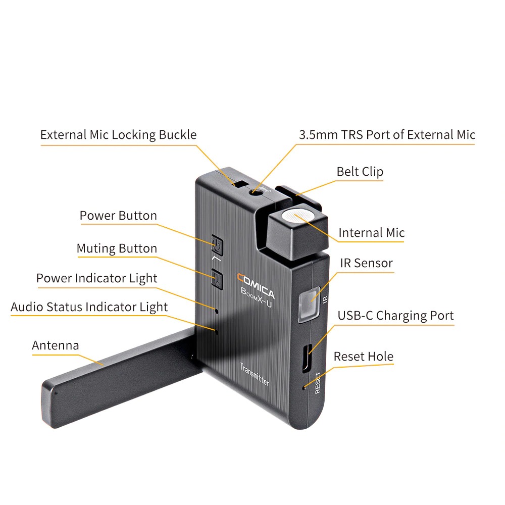 Transmitter có một micro được tích hợp và một cổng jack 3.5mm cho Lavalier micro ngoài (chỉ được sử dụng 1 trong 2 mic tại 1 thời điểm).