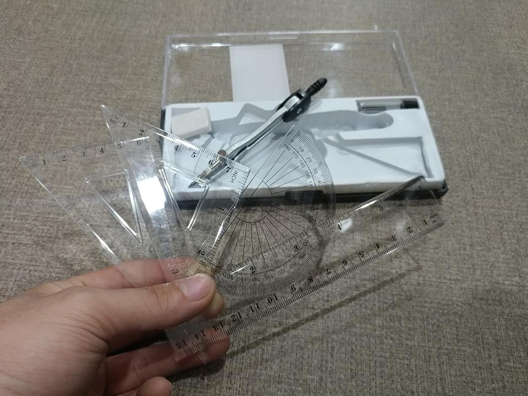 Bộ sản phẩm đầy đủ 6 món (compa, ngòi chì kim, 2 eke, thước kẻ, thước đo độ) chuẩn bộ đồ dùng các bạn học sinh thường dùng được xếp gọn gàng trong một chiếc