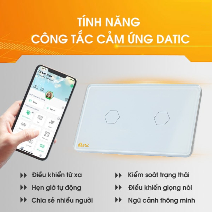 Công tắc thông minh HUNONIC DATIC 2 nút màu trắng - Điều khiển từ xa bằng điện thoại - Bảo hành 1 năm