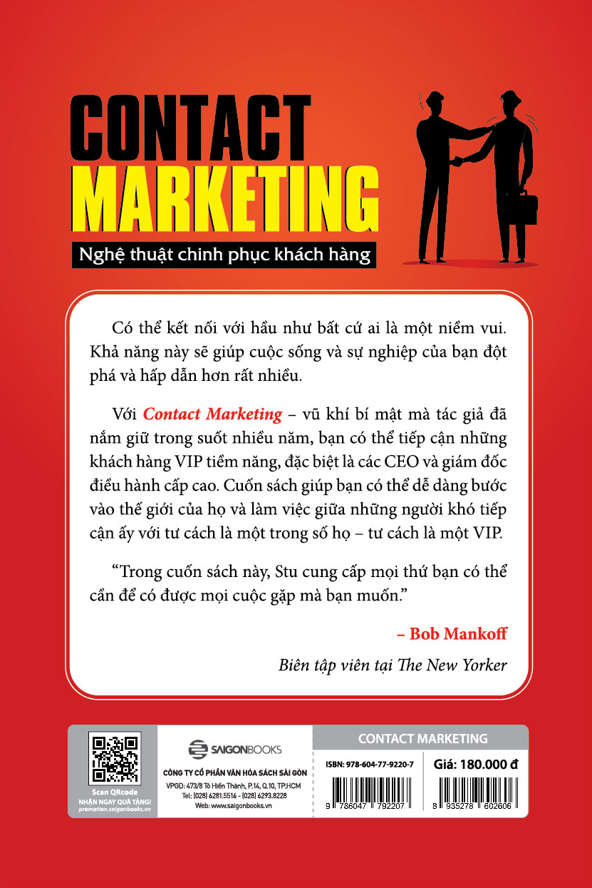 Contact Marketing – Nghệ thuật chinh phục khách hàng không đơn giản là một cuốn sách về marketing hay bán hàng, mà về cả hai. Cuốn sách viết về việc sử dụng Chiến dịch Liên hệ để hỗ trợ trực tiếp cho các chiến dịch bán hàng quan trọng và nhanh chóng mở rộng quy mô doanh nghiệp. Nó mang lại cho bạn một lợi thế không công bằng trên thị trường và là nhiên liệu khiến việc kinh doanh của bạn bứt phá như tên lửa. Và bất kỳ ai cũng có khả năng thực hiện Contact Marketing.