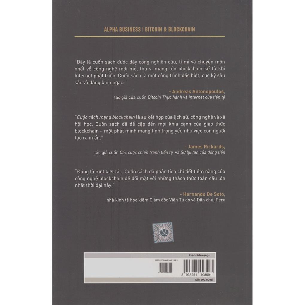 Mua tại TiktokCuộc Cách Mạng Blockchain Công nghệ có thể tác động lớn đến tương lai của nền kinh tế thế giới đã xuất hiện, đó không phải là ô tô tự lái, là năng lượng mặt trời hay trí thông minh nhân tạo. Đó chính là Blockchain. Thế hệ thứ nhất của cuộc cách mạng số hóa đã đưa chúng ta đến với kỷ nguyên Internet của thông tin. Thế hệ thứ hai – được tiếp sức bởi công nghệ blockchain – đang đưa chúng ta đến với Internet của giá trị: một nền tảng phi tập trung mới mẻ, thứ có thể giúp chúng ta tái định hình ngành kinh doanh và thay đổi cách thức hoạt động của con người theo hướng tốt hơn. Cuộc cách mạng Blockchain là cuốn sách lý giải tiềm năng kiến tạo tương lai nhân loại của công nghệ blockchain. Cuốn sách là công trình được nghiên cứu kỹ lưỡng với lối trình bày gần gũi dễ hiểu, phù hợp với cả những người chuyên và không chuyên về công nghệ.