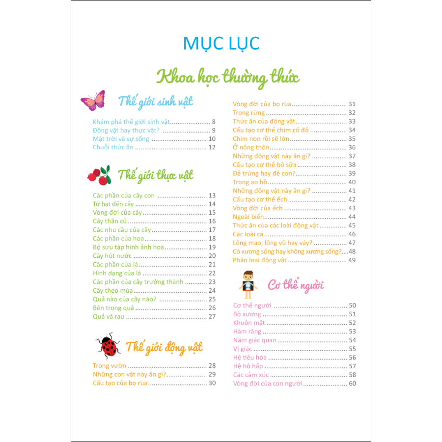 Nội dung phong phú: Cuốn sách bao gồm nhiều chủ đề đa dạng như: thế giới động vật, thực vật, con người, trái đất, vũ trụ,... giúp bé có cái nhìn tổng quan về thế giới.