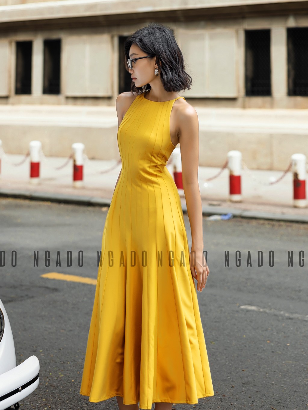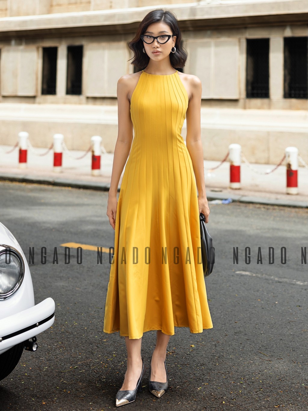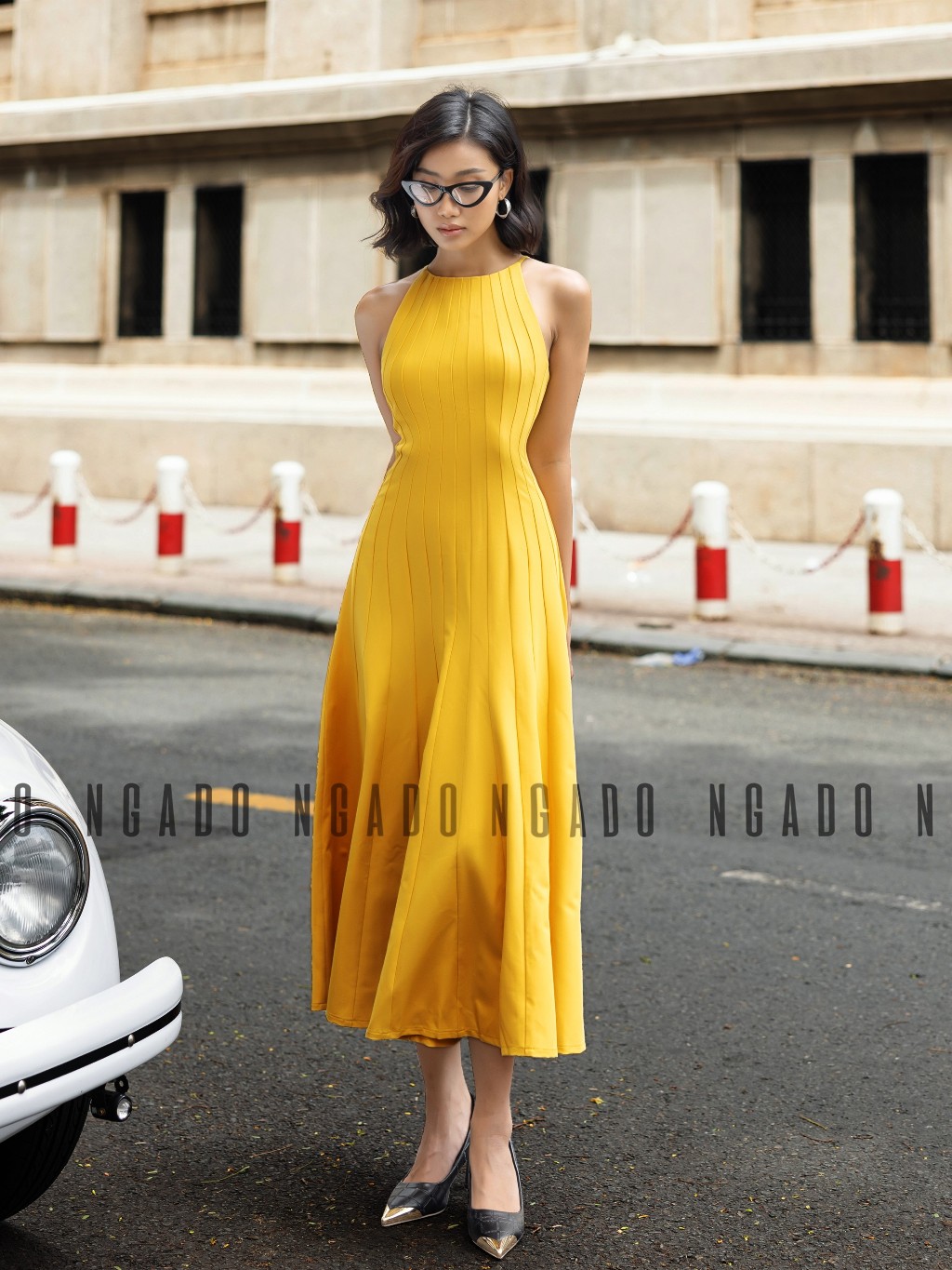 ✨Đầm vàng cổ yếm NGADO, Đầm xòe hở vai, Đầm dự tiệc, Đầm dạo phố