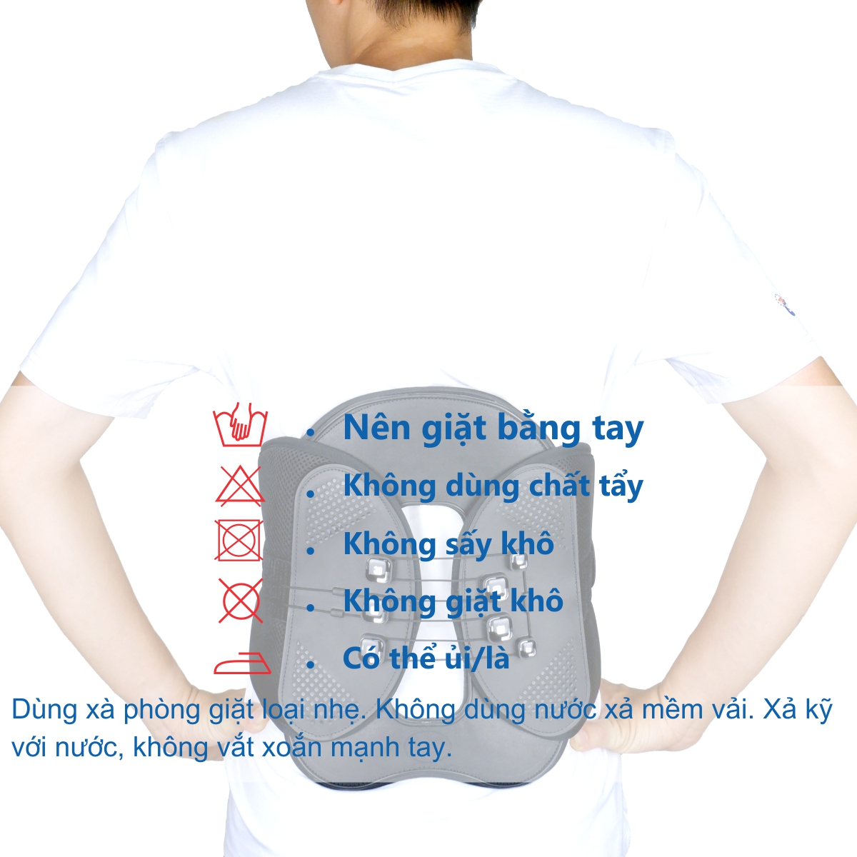 Được thiết kế với hai thanh nẹp cứng giúp chống đỡ cột sống thắt lưng tốt hơn, ngoài ra áo còn để hở vùng cột sống thắt lưng, giúp cho việc chăm sóc vết thương