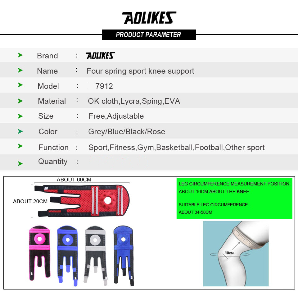 Mua tại TiktokĐai quấn bảo vệ đầu gối AOLIKES A-7912 spring sport knee support AOLIKES 1PCS HONOR Spring Adjustable Sports Leg Knee Support Brace Wrap Pads Sleeve Cap Bộ 2 đai bó quấn bảo vệ đầu gối hỗ trợ dây chằng khớp gối tránh xô lệch trệch khớp Four spring sport knee support AOLIKES A-7912 thiết kế có hàng trăm lỗ nhỏ, giúp thoát mồ hôi, không gây bí cho người dùng. Ngoài ra còn có 2 vân cao su được viền xung quanh phần đai cuốn, tăng sự tự tin vận động cho người tập thể thao, không sợ trơn trượt ngay cả khi thực hiện các bài tập gập gối. Đai quấn gối ra đời nhằm mục đích giúp bạn chống lại thương tích có thể xảy ra và hỗ trợ các vùng cơ yếu. Thông tin sản phẩm