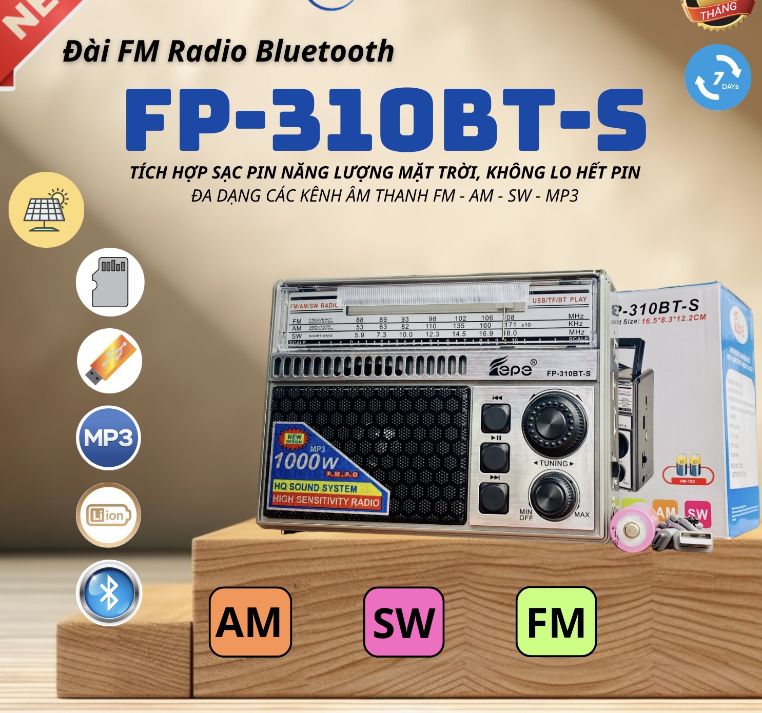 -----Đài radio NHẬT FP-310BT-S có những đặc điểm nổi bật sau: - Công suất loa to 10W - Tấm pin năng lượng mặt trời tiện dụng - Có 3 màu dễ lựa chọn - Pin