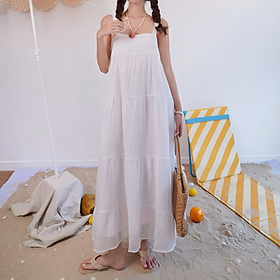 Váy đầm hai dây maxi xòe tầng đi biển dáng babydoll rộng chất đũi mềm mát