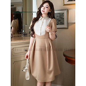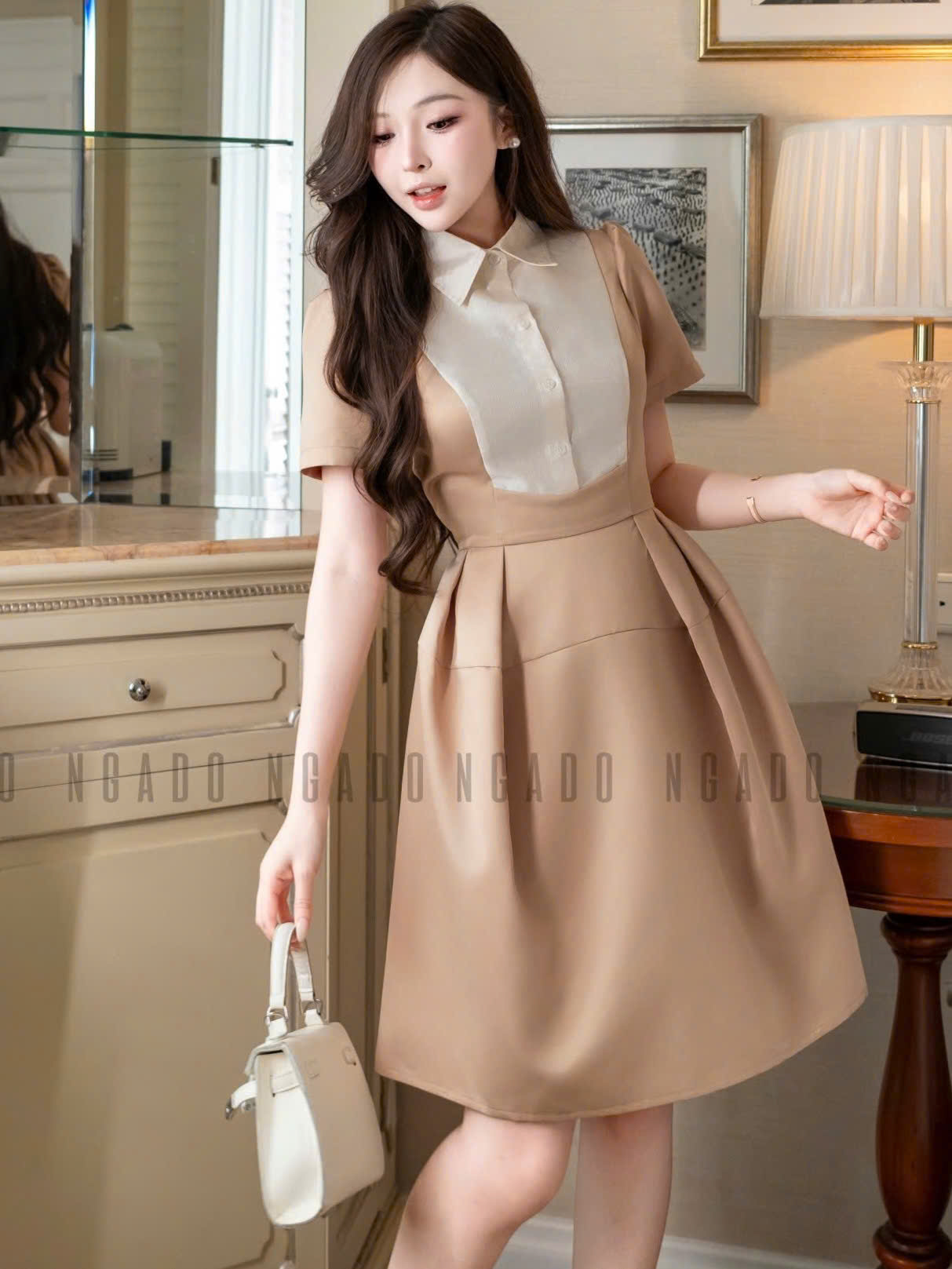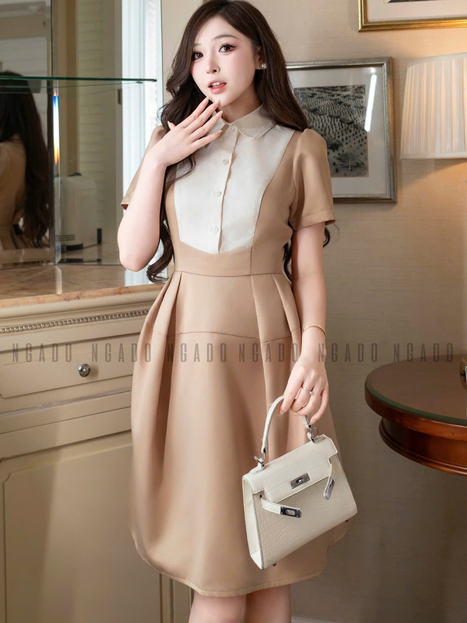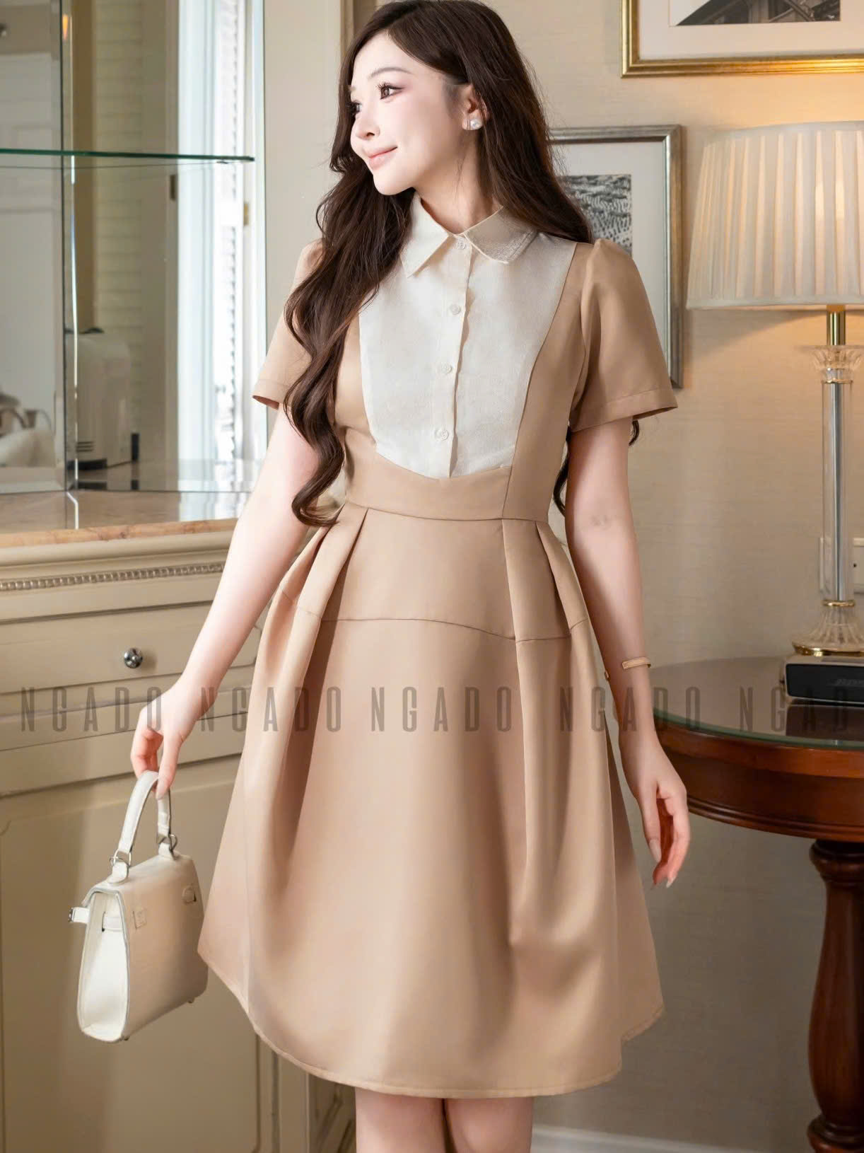 ✨Đầm nâu cổ phối trắng NGADO , đầm dạo phố , đầm công sở