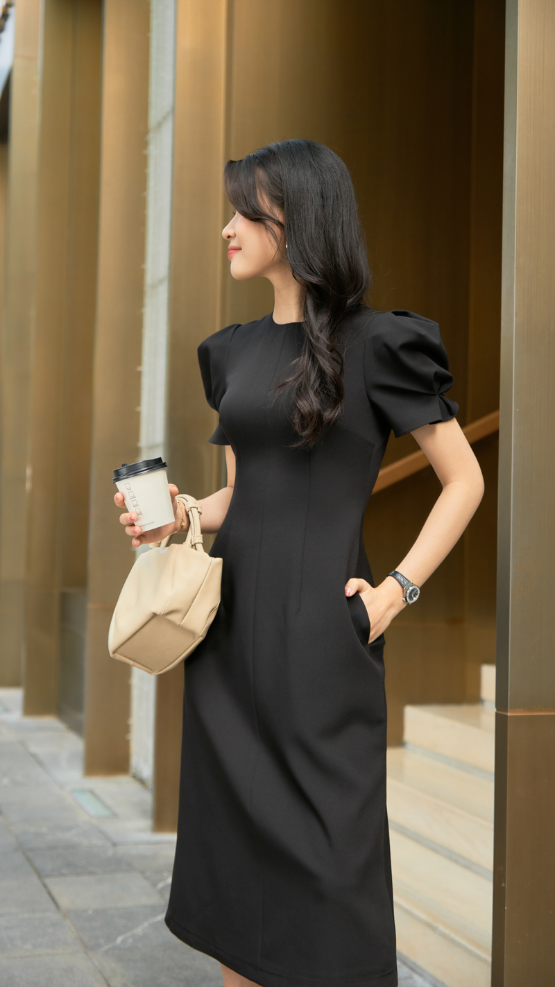 ✨Đầm xòe cổ tròn , hông phồng, tay bồng ngắn, xếp ly tay trước AURA thiết kế cao cấp WHITE CHIC