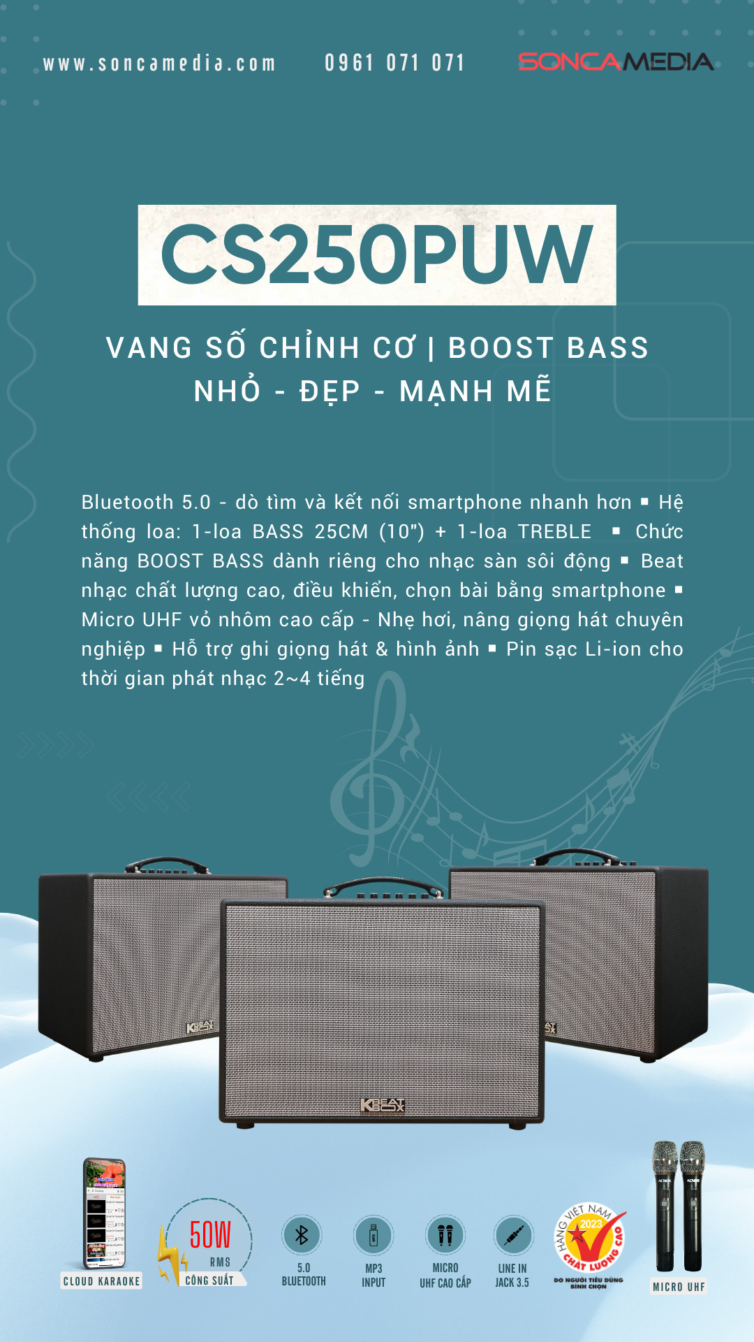 Dàn âm thanh di động xách tay CS250PUW - Loa karaoke di động xách tay CS250PUW TÍNH NĂNG NỔI BẬT - Nhỏ gọn xách tay - Tích hợp vang số chỉnh cơ - Chức năng boost bass dành riêng cho nhạc sàn sôi động THÔNG SỐ KỸ THUẬT - Màu sắc : Màu đen - Màu lưới : Lưới Xám (logo KBEATBOX) - Loại thùng : Thùng gỗ bọc da - quai xách - Bluetooth 5.0 - Nguồn cấp : 110~240VAC, 50/60Hz (auto volt) - Pin : Pin sạc Li-ion 15V-2200mAh (33Wh) - Hệ thống loa : BASS 25CM (10") + TREBLE - Công suất RMS : 50W (max) - Công suất PMPO : 300W (max) - Ngõ kết nối : MP3 USB, LINE IN (jack 3.5 mm) - Cân nặng : 8 Kg - Kích thước thùng carton (RxCxS) : 480 x 400 x 265 mm