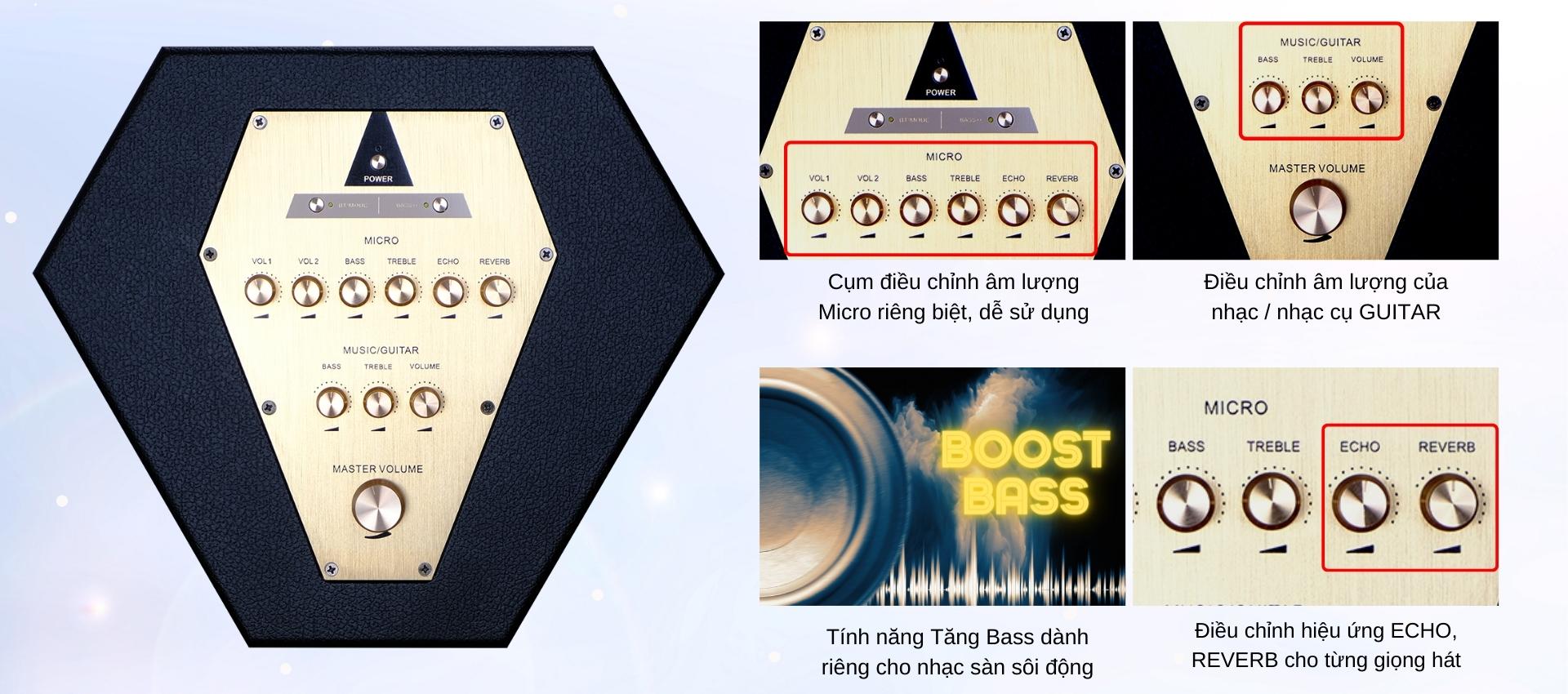 • Cụm điều chỉnh Micro riêng biệt bao gồm: Âm lượng từng micro, âm Bass, Âm Treble, ECHO (độ vang của giọng hát / giọng nói), REVERB (hiệu ứng vọng lại của giọng hát / giọng nói)