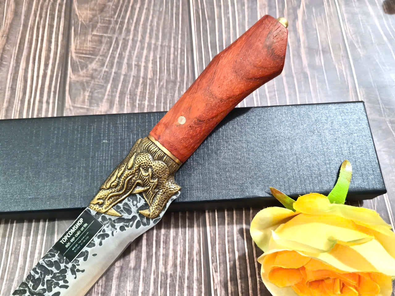 Chất liệu tay cầm: gỗ cẩm lai, khâu và chuôi cuối dao bằng đồng thau