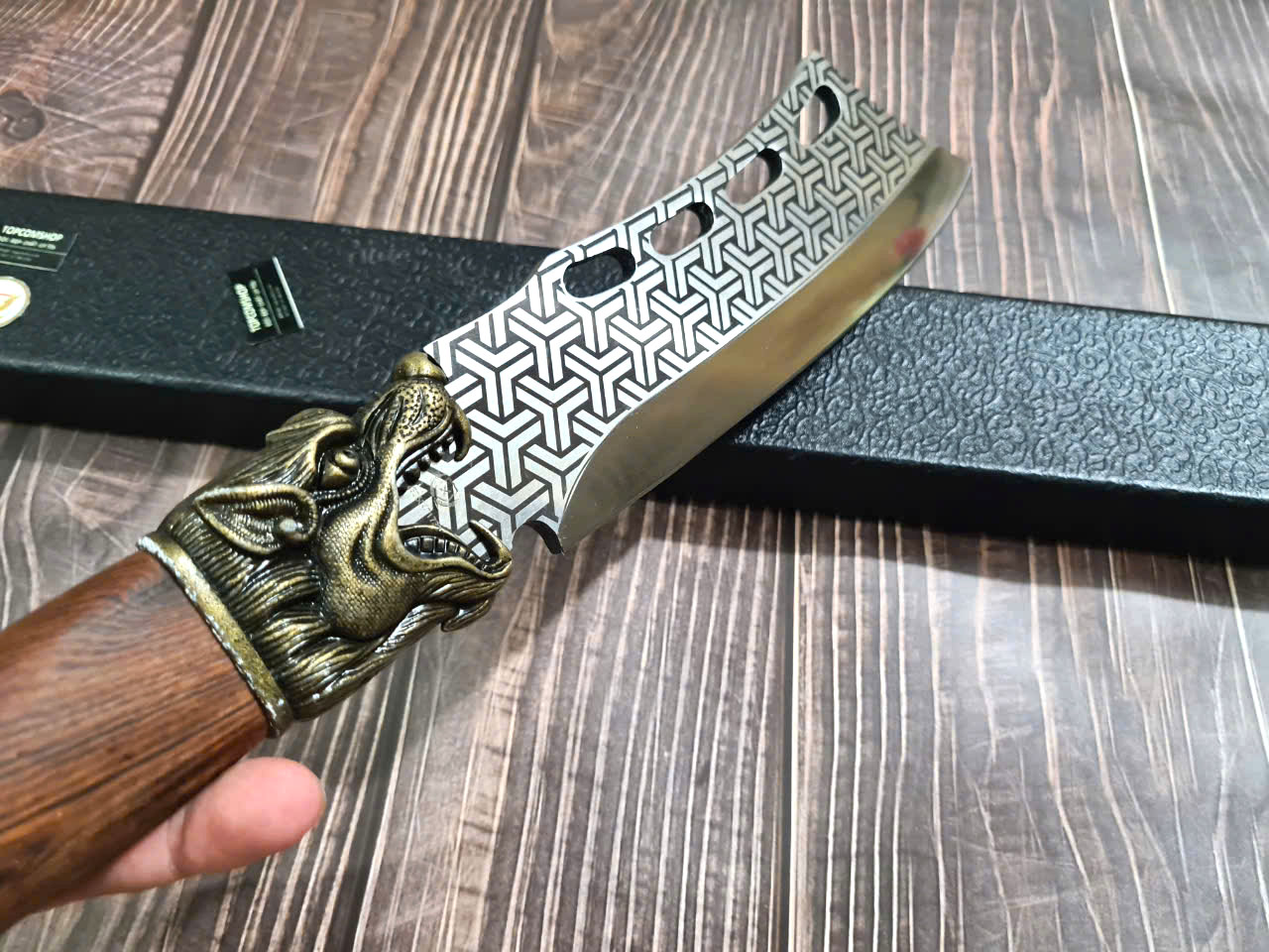 - Chức năng: Chặt xương ống, chân giò, trâu bò - Kích thước: Lưỡi: 22cm, cán: 10cm, rộng: 10cm, dầy: 5ly, trọng lượng: 800g - Cán : Gỗ mun, Khâu đồng đỏ , chốt đinh