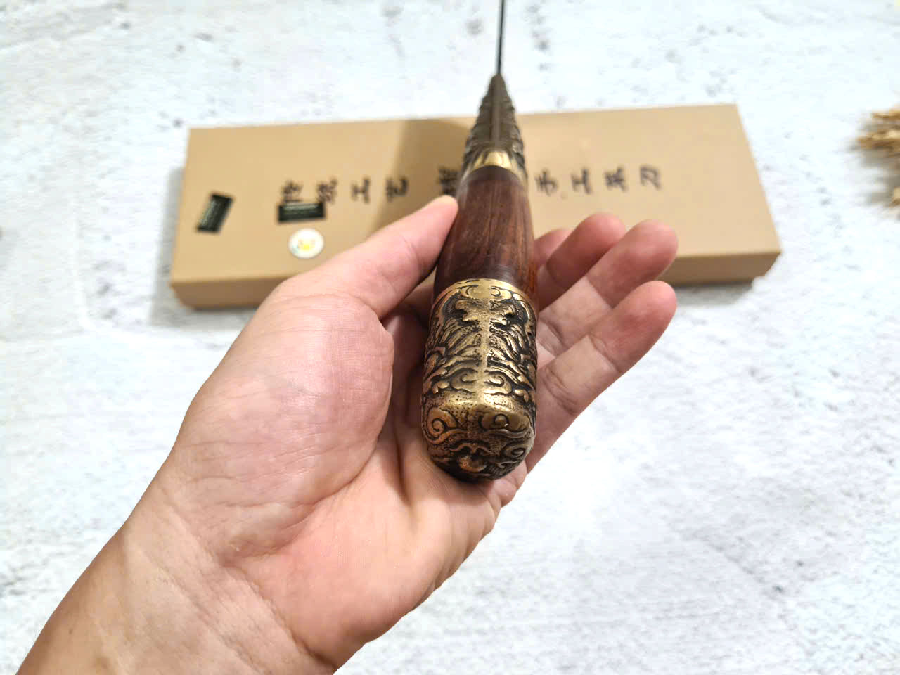 Chất liệu tay cầm: gỗ CẨM LAI, khâu và chuôi cuối dao bằng đồng thau