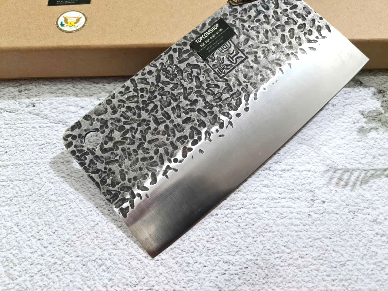 - Chức năng: Chặt xương ống, chân giò, trâu bò - Kích thước: Lưỡi: 22cm, cán: 10cm, rộng: 10cm, dầy: 5ly, trọng lượng: 800g - Cán : Gỗ mun, Khâu đồng đỏ , chốt đinh