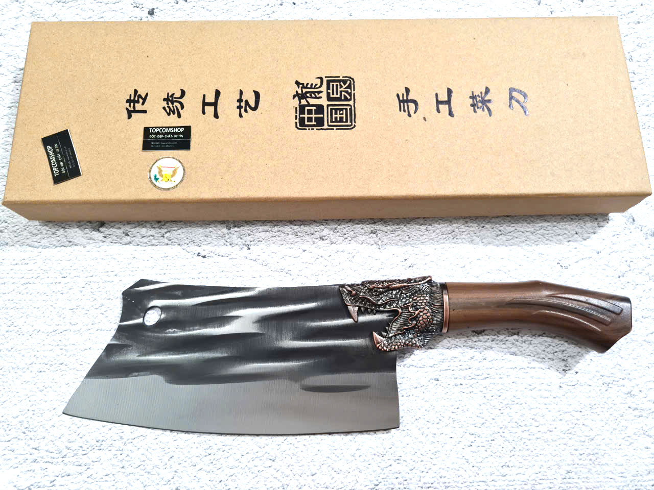 - Chức năng: Chặt xương ống, chân giò, trâu bò - Kích thước: Lưỡi: 22cm, cán: 10cm, rộng: 10cm, dầy: 5ly, trọng lượng: 800g - Cán : Gỗ mun, Khâu đồng đỏ , chốt đinh