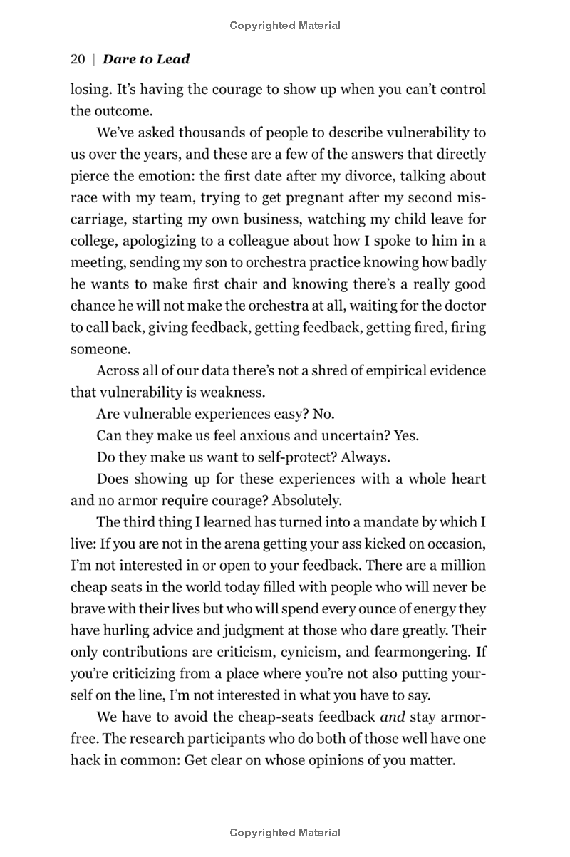 Brené writes, ‘One of the most important findings of my career is that courage can be taught, developed and measured. Courage is a collection of four skill sets supported by twenty-eight behaviours. All it requires is a commitment to doing bold work, having tough conversations and showing up with our whole hearts. Easy? No. Choosing courage over comfort is not easy. Worth it? Always. We want to be brave with our lives and work. It's why we're here.’