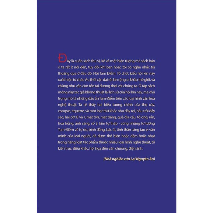 Đây là cuốn sách thú vị, kể về một hiện tượng mà sách báo ở ta rất ít nói đến, tuy đôi khi bạn hoặc tôi có nghe nhắc tới thoáng qua ở đâu đó: Hội Tam Điểm. Tổ chức kiểu hội kín này xuất hiện từ châu Âu thời cận đại rồi lan rộng ra khắp thế giới, và chừng như vẫn còn tồn tại đương thời với chúng ta. Ở tập sách mỏng này tác giả không thuật lại lịch sử của hội kín này, mà chú trọng mô tả những dấu ấn Tam Điểm trên các loại hình văn hóa nghệ thuật. Ta sẽ thấy hai biểu tượng chính của thợ xây, com-pa, ê-ke, và một loạt thứ khác như dây rọi, bầu trời đầy sao, hai cột B và J, mặt trời, mặt trăng, tổ ong, rắn, hoa hồng, ánh sáng, số 3, kim tự tháp – cùng những tư tưởng Tam Điểm về Tự do – Bình đẳng – Bác ái, tinh thần sáng tạo vì văn minh của loài người, đã được thể hiện hoặc đậm hoặc nhạt trong hàng loạt tác phẩm thuộc nhiều loại hình nghệ thuật, từ kiến trúc, điêu khắc, hội họa đến văn chương, điện ảnh.