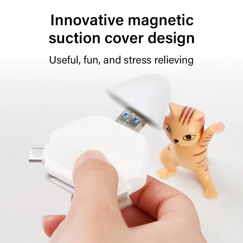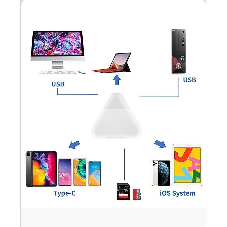 Thông số sản phẩm : Chất liệu : Nhựa ABS Kích thước : 65x65x65 mm Cổng kết nối : Type C, USB, L 8 pin Đầu đọc thẻ : SD , Micro SD (TF) Giúp