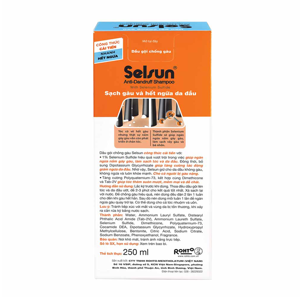 Thành phần Water, Ammonium Lauryl Sulfate, Distearyl Phthalic Acid Amide ( Tab 2), Ammonium Laureth Sulfate, Selenium Sulfide, Dimethicone, Cocamide DEA, Hydroxylpropyl Methylcenllulose, Bentonite, Citric Acid, Sodium Citrate, DMDM Hydantoin, Fragrance. Công dụng Dầu gội giúp làm sạch vảy gàu và bả nhờn, làm sạch tóc và da đầu. Chứa các thành phần dưỡng tóc, giúp tóc suông mượt. Cách sử dụng Thoa đều dầu gội lên tóc và da đầu ướt, để 2-3 phút cho kết quả tốt nhất. Xả sạch lại với nước. Dùng 2 lần 1 tuần cho đến khi gàu . Sau đó nên dùng mỗi tuần 1 lần Bảo quản: Nơi thoáng mát, tránh ánh nắng trực tiếp Quy cách đóng gói: Chai 250ml Thương hiệu: Selsun Sản xuất tại: Việt Nam Xuất xứ thương hiệu: Việt Nam Số Giấy công bố: 007/22/CBMP-BD