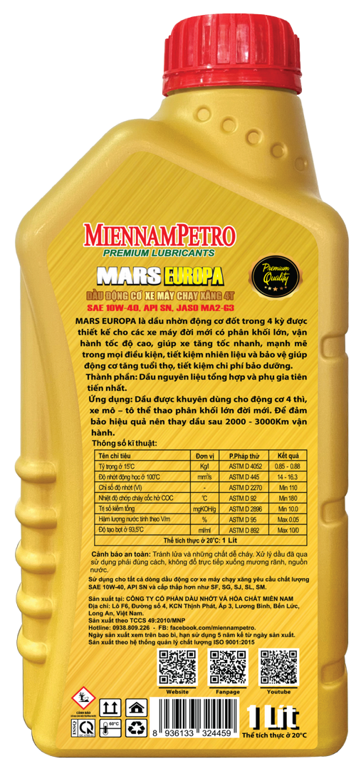 Dầu Nhớt MiennamPetro Mars Europa 4T 10W-40 API SN JASO MA2 1L Bảo Vệ Động Cơ Xe Máy 4 Thì Và Tiết Kiệm Nhiên LiệuDầu Nhớt MiennamPetro Mars Europa 4T 10W-40 API SN JASO MA2 1L Bảo Vệ Động Cơ Xe Máy 4 Thì Và Tiết Kiệm Nhiên Liệu