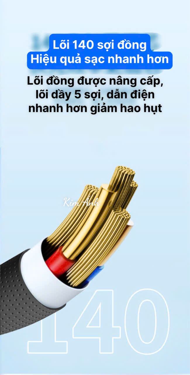 Lỗi đồng 140 sợi dầy tăng tốc độ sạc gấp 5 lần so với cáp thông thường, chống nhiễu, truyền tải và sạc mượt mà