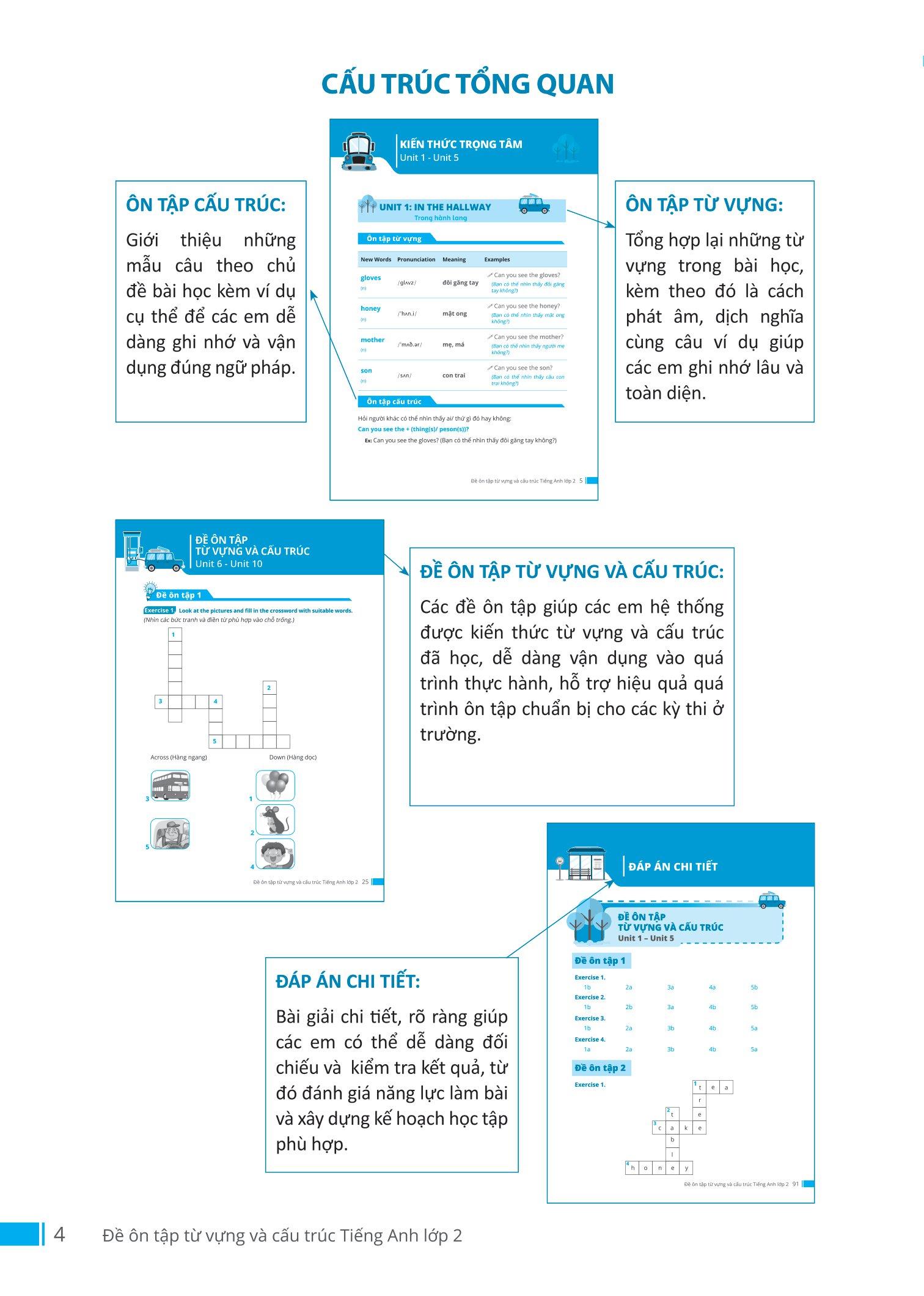 Mua tại TiktokBộ sách Đề ôn tập từ vựng và cấu trúc Tiếng Anh đã hệ thống toàn bộ kiến thức và xây dựng bài tập một cách logic với những ví dụ dễ hiểu. Bên cạnh đó, để khơi gợi hứng thú cho các bé trong quá trình học tập, mỗi cuốn sách đều có những hình ảnh minh họa sinh động, các bé không chỉ có thể học cùng bố mẹ, mà còn có thể tự học một cách dễ dàng, từ đó hình thành tư duy cũng như tính tự lập. NHỮNG ƯU ĐIỂM VƯỢT TRỘI CỦA CUỐN SÁCH: