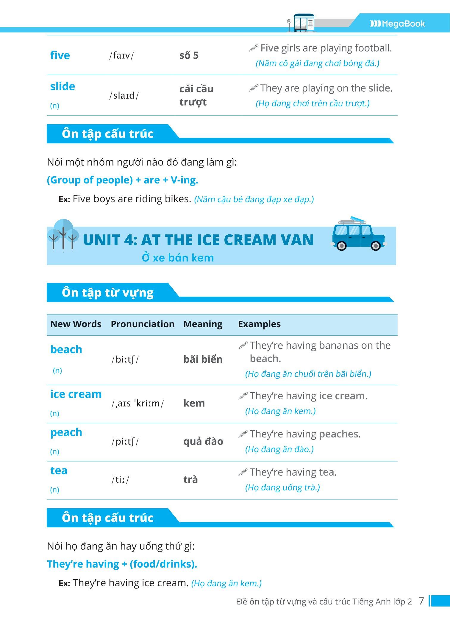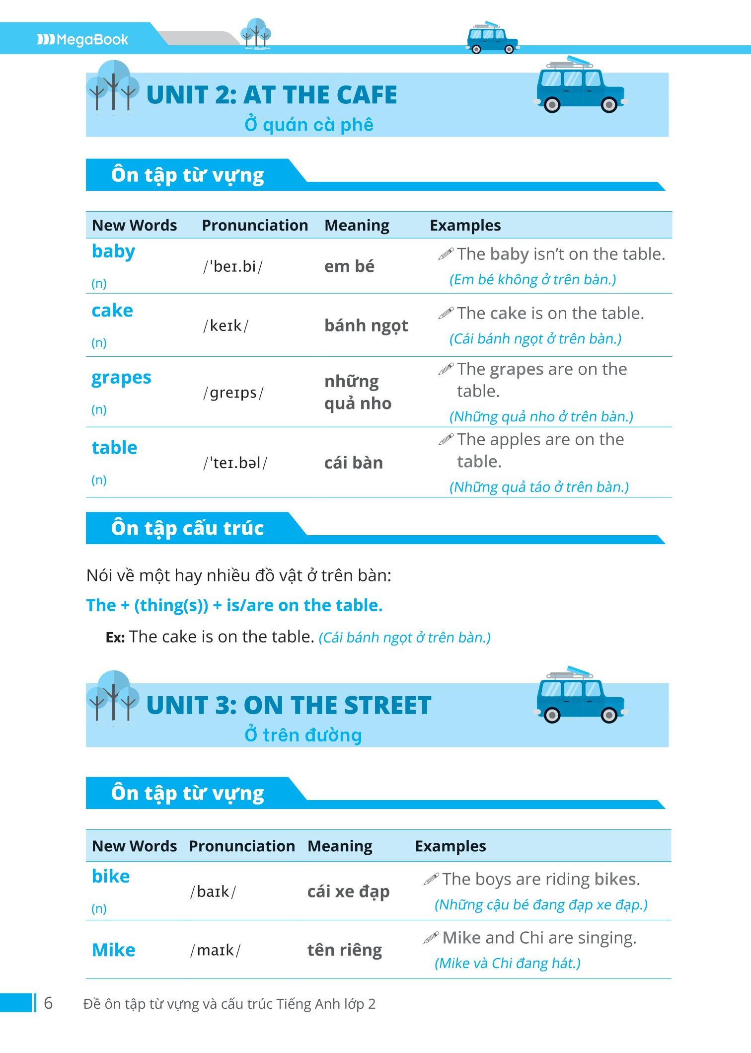 - Sách tổng hợp kiến thức trọng tâm về cả cấu trúc và từ vựng ÔN TẬP CẤU TRÚC: Giới thiệu những mẫu câu theo chủ đề bài học kèm ví dụ cụ thể để các em dễ dàng ghi nhớ và vận dụng đúng ngữ pháp. ÔN TẬP TỪ VỰNG: Tổng hợp lại những từ vựng trong bài học, kèm theo đó là cách phát âm, dịch nghĩa cùng câu ví dụ giúp các em ghi nhớ lâu và toàn diện.