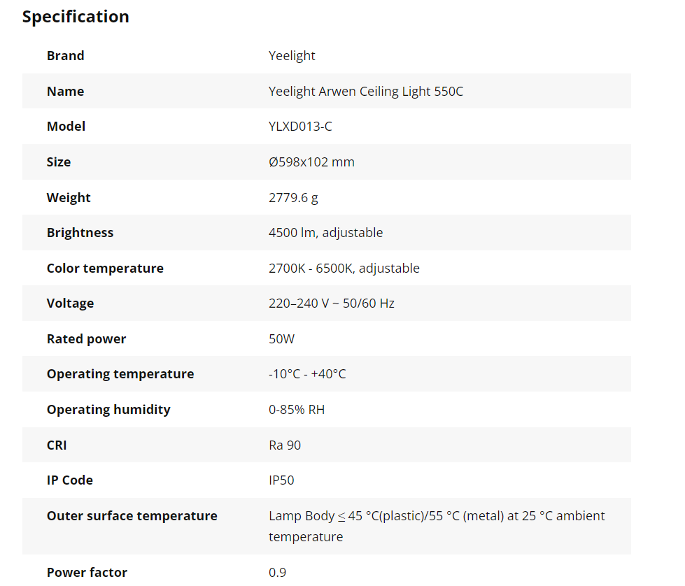 - Đèn đã bao gồm 1 Yeelight Remote Bluetooth Đèn thông minh Yeelight – Nguồn ánh sáng chất lượng cao cho cả gia đình Đèn trần Yeelight Arwen C có hai kích thước: φ495mm và φ599mm phù hợp với phòng 15-25㎡ và 20-30㎡. Viền đèn được bo cong mềm mại dành cho những ai đề cao tính thẩm mỹ nhẹ nhàng. Phía sau đèn là dải đèn LED Ambiance RGB. Cả hai phần đèn đều có thể thay đổi độ sáng và màu sắc bằng app Yeelight. Đèn Yeelight Arwen C có công suất 50W, đủ chiếu sáng cho mọi hoạt động trong nhà. Đa dạng khả năng điều khiển Đèn ốp trần Yeelight Arwen có thể điều khiển thông qua ứng dụng Yeelight. Đèn có thể tùy chỉnh độ sáng từ 0-100% từ màu vàng . Kết hợp cùng các nền tảng Smart Home như Google Gome hay Alexa và điều khiển bằng giọng nói: