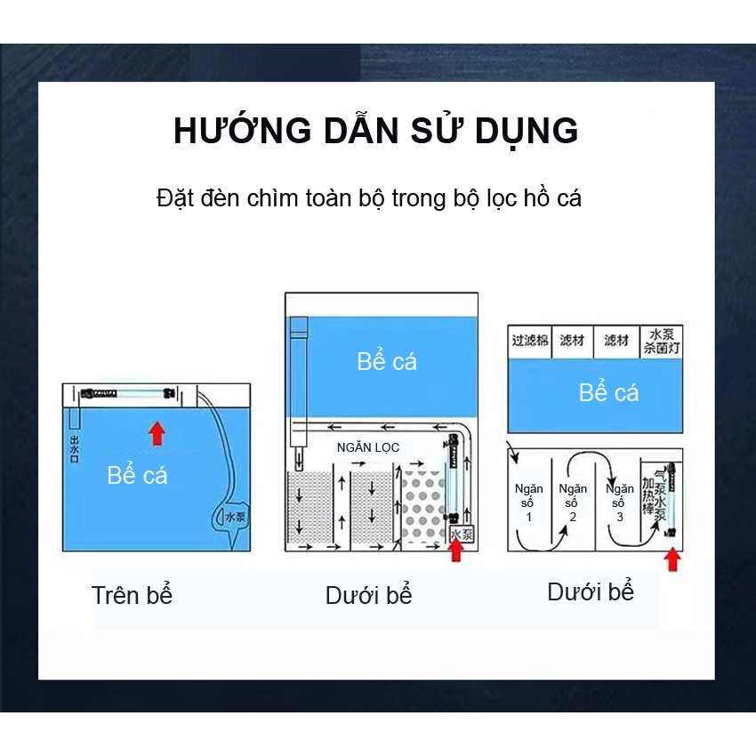 Vị trí lắp đặt: Có thể đặt đèn ở ngăn bơm hoặc ngăn lắng trong hệ thống lọc của hồ.
