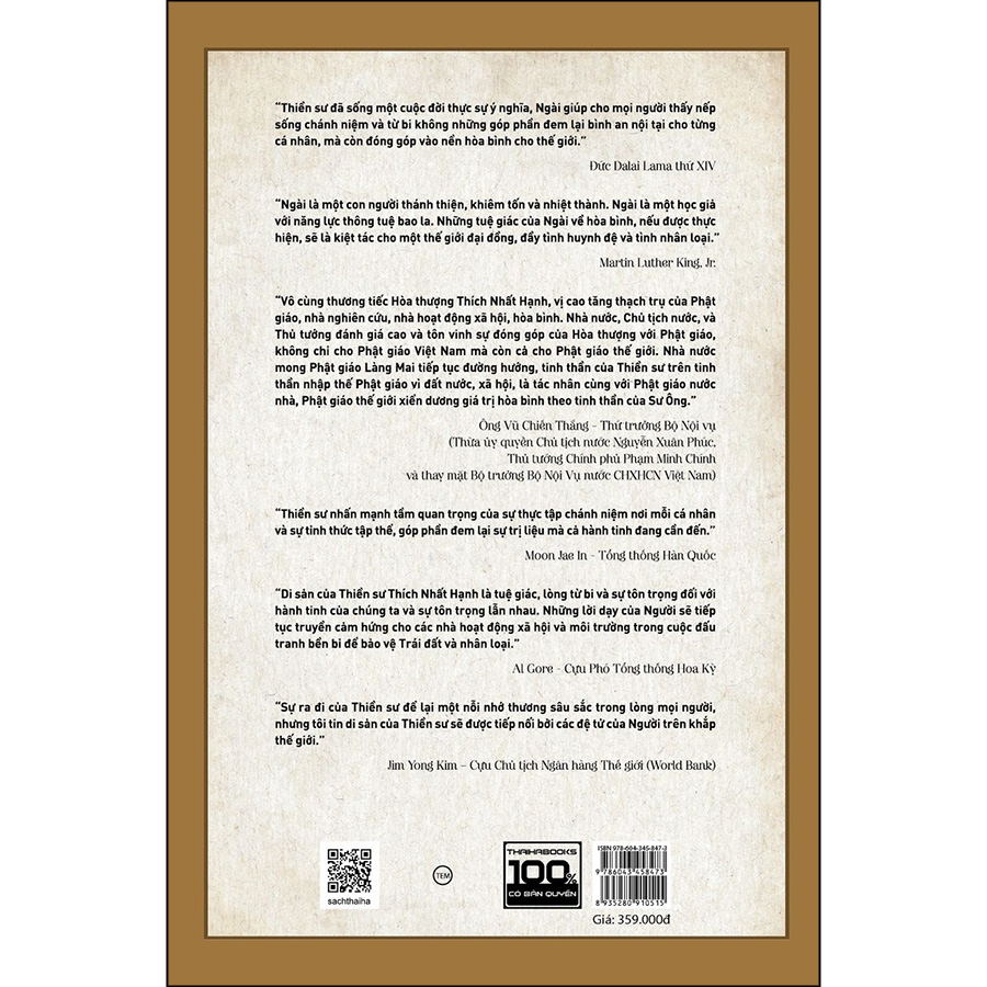 Mua tại TiktokĐức Trưởng lão Hòa thượng - Thiền sư Thích Nhất Hạnh một bậc danh Tăng không chỉ ở Việt Nam mà còn trên thế giới. Trong suốt cuộc đời hành đạo và hoằng pháp của mình, Thiền sư đã mang lời dạy của đức Bụt đến gần hơn với mọi người thông qua những phương pháp về thực tập chánh niệm, tỉnh thức. Bằng sự dung hòa các truyền thống Phật giáo Nguyên Thủy, Phật giáo Đại thừa, và các phát kiến của ngành Tâm lý học đương đại phương Tây, Thầy đã thiết lập cách tiếp cận hiện đại đối với thiền. Ngài được vinh danh như một lãnh đạo tinh thần của Phật giáo có sức ảnh hưởng chỉ sau Đức Đạt Lai Lạt Ma tại phương Tây.