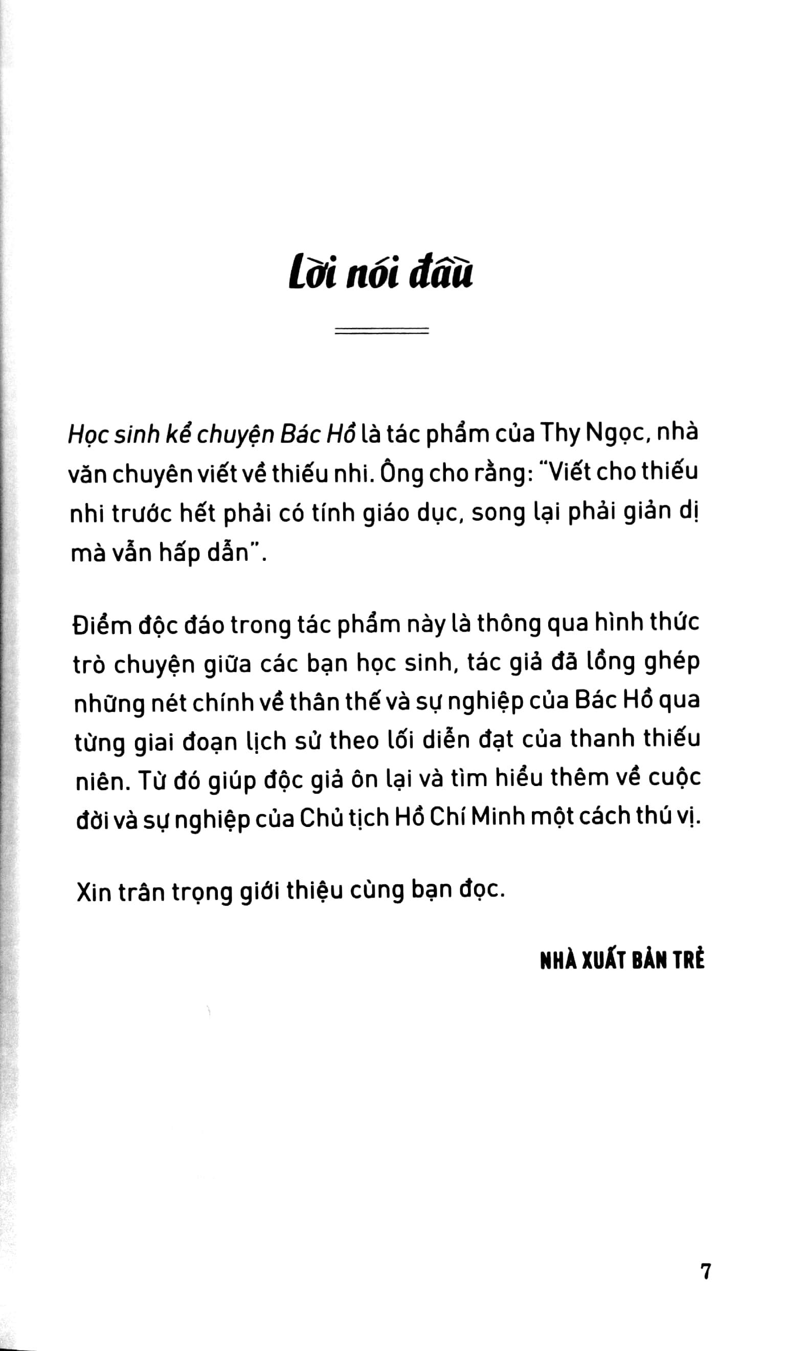 Mua tại TiktokHọc sinh kể chuyện Bác Hồ là tác phẩm của Thy Ngọc, nhà văn chuyên viết về thiếu nhi. Ông cho rằng: “Viết cho thiếu nhi trước hết phải có tính giáo dục, song lại phải giản dị mà vẫn hấp dẫn”. Điểm độc đáo trong tác phẩm này là thông qua hình thức trò chuyện giữa các bạn học sinh, tác giả đã lồng ghép những nét chính về thân thế và sự nghiệp của Bác Hồ qua từng giai đoạn lịch sử theo lối diễn đạt của thanh thiếu niên. Từ đó giúp độc giả ôn lại và tìm hiểu thêm về cuộc đời và sự nghiệp của Chủ tịch Hồ Chí Minh một cách thú vị.