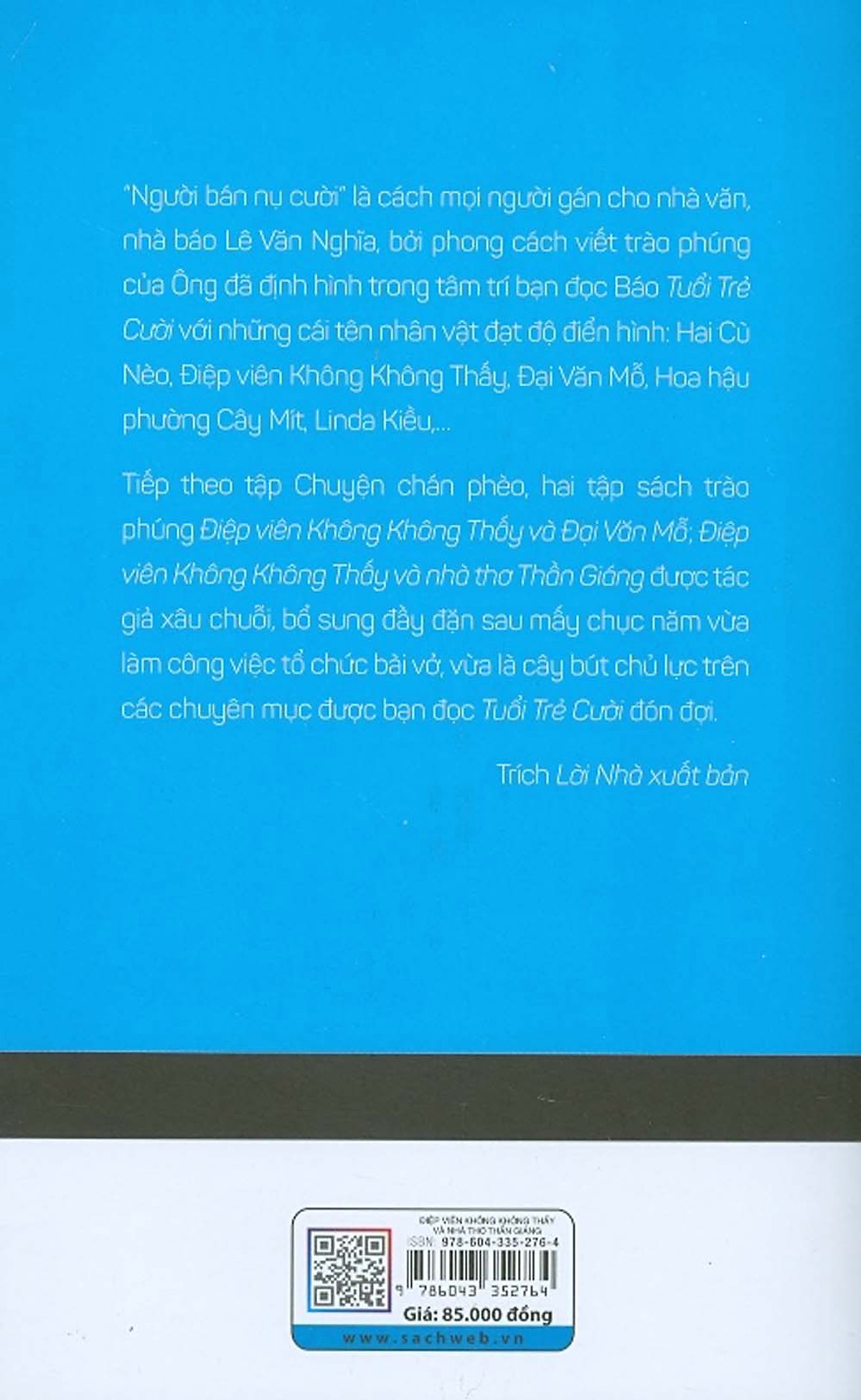 Tác giả Lê Văn Nghĩa sinh ngày 20/05/1953 tại tỉnh Chợ Lớn. Ông “thuộc thế hệ thanh niên học sinh Sài Gòn trưởng thành trong phong trào đấu tranh đô thị trước 1975. Ông từng xuống đường lãnh đạo thanh niên học sinh đấu tranh trực diện với cảnh sát, từng bị bắt, trải qua một số nhà tù giam của chế độ Việt Nam Cộng hòa, kể cả ở Côn Đảo. Sau ngày thống nhất đất nước, Lê Văn Nghĩa thuộc thế hệ làm báo đầu tiên của báo Tuổi Trẻ, cùng với làng báo TP.HCM lúc bấy giờ góp phần xây dựng đời sống mới. Ông làm việc tại báo Tuổi Trẻ từ năm 1975 đến năm 2015”. “Người bán nụ cười” là cách mọi người gán cho nhà văn, nhà báo Lê Văn Nghĩa, bởi phong cách viết trào phúng của Ông đã định hình trong tâm trí bạn đọc Báo Tuổi Trẻ Cười với những cái tên nhân vật đạt độ điển hình: Hai Cù Nèo, Điệp viên Không Không Thấy, Đại Văn Mỗ, Hoa hậu phường Cây Mít, Linda Kiều… 34 mẩu chuyện trong tập “Điệp viên Không Không Thấy và Đại Văn Mỗ” cùng 36 mẩu chuyện trong tập “Điệp viên Không Không Thấy và nhà thơ Thần Giáng” đều mang dáng dấp các “thói hư tật xấu” của một ai đó trong cuộc đời này. Nếu như ở “Điệp viên Không Không Thấy và Đại Văn Mỗ” - ta bật ngửa và phì cười vì những tình huống “phá án” trong “Đường dây phim sex”, “Nghiệp vụ ngửi mùi hương”, “Điệp vụ mò đường”, “Lộ tẩy”, “Nhà sưu tập tranh”…; thì đến “Điệp viên Không Không Thấy và nhà thơ Thần Giáng” - ngòi bút trào phúng và duyên dáng của Lê Văn Nghĩa cho người đọc thấy những màn “nhập đồng”, làm ra “thơ thần” chỉ toàn là trò lừa, chiêu đánh bóng bản thân qua “Ai là nhân tài?”, “Đấu giá chữ ký”, “Thần chú”, “Những người không thích đùa”, “‘Mê tốt’ mới”…
