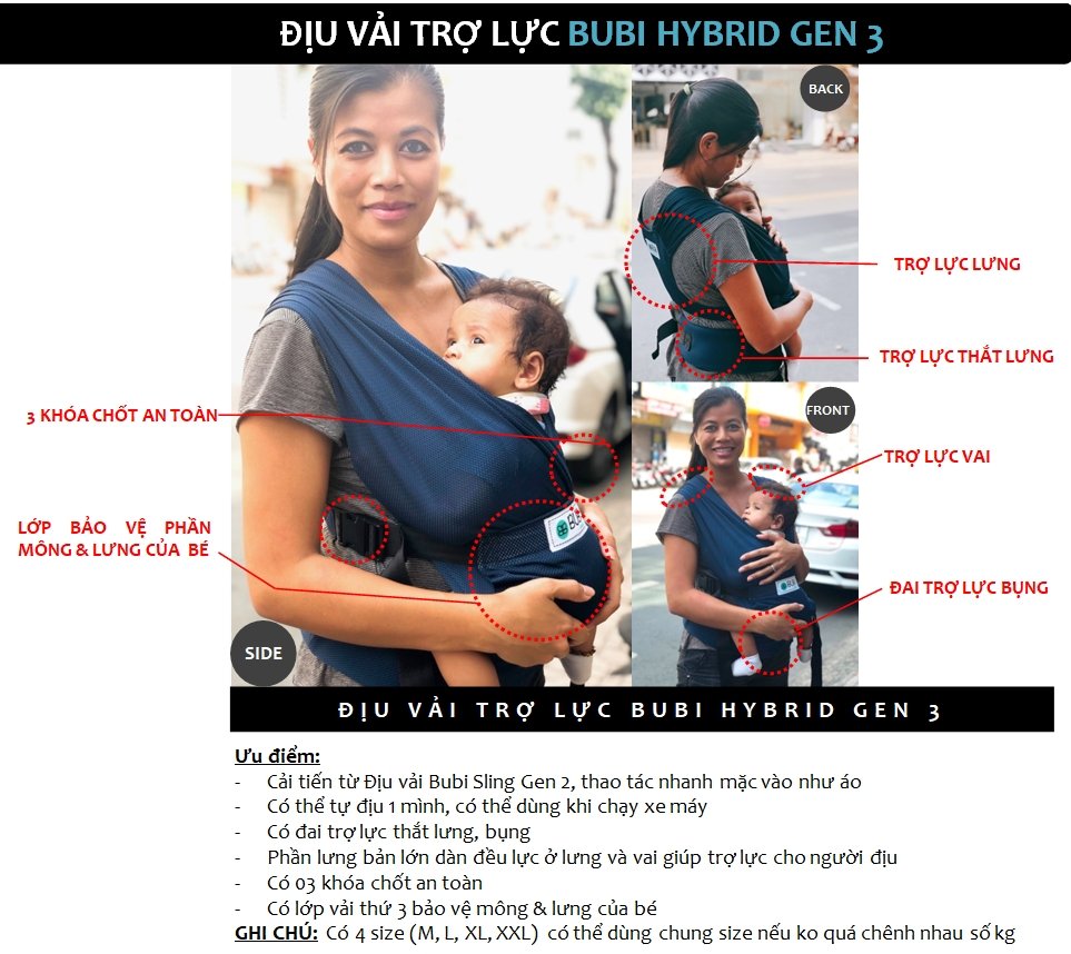 ƯU ĐIỂM CỦA BUBI Hybrid Gen 3:+ Nhiều size VỪA VẶN với nhiều dáng người khác nhau và đặc biệt phù hợp với chiều cao và hình dáng người Châu Á+ Địu được trẻ nhỏ từ sơ sinh tới 2 tuổi (từ 3,5kg - 13kg...