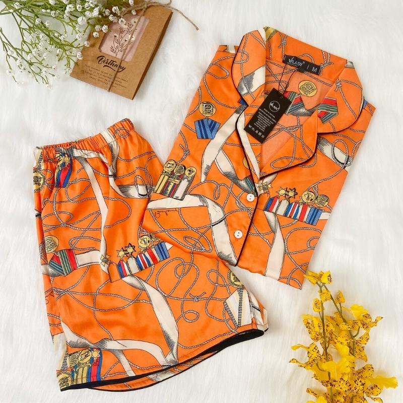 Đồ bộ Pyjama lụa, đồ mặc nhà nữ VILADY - B134 kiểu quần đùi tay cộc, họa tiết siêu dễ thương, chất liệu lụa Pháp ( lụa latin) - Màu cam