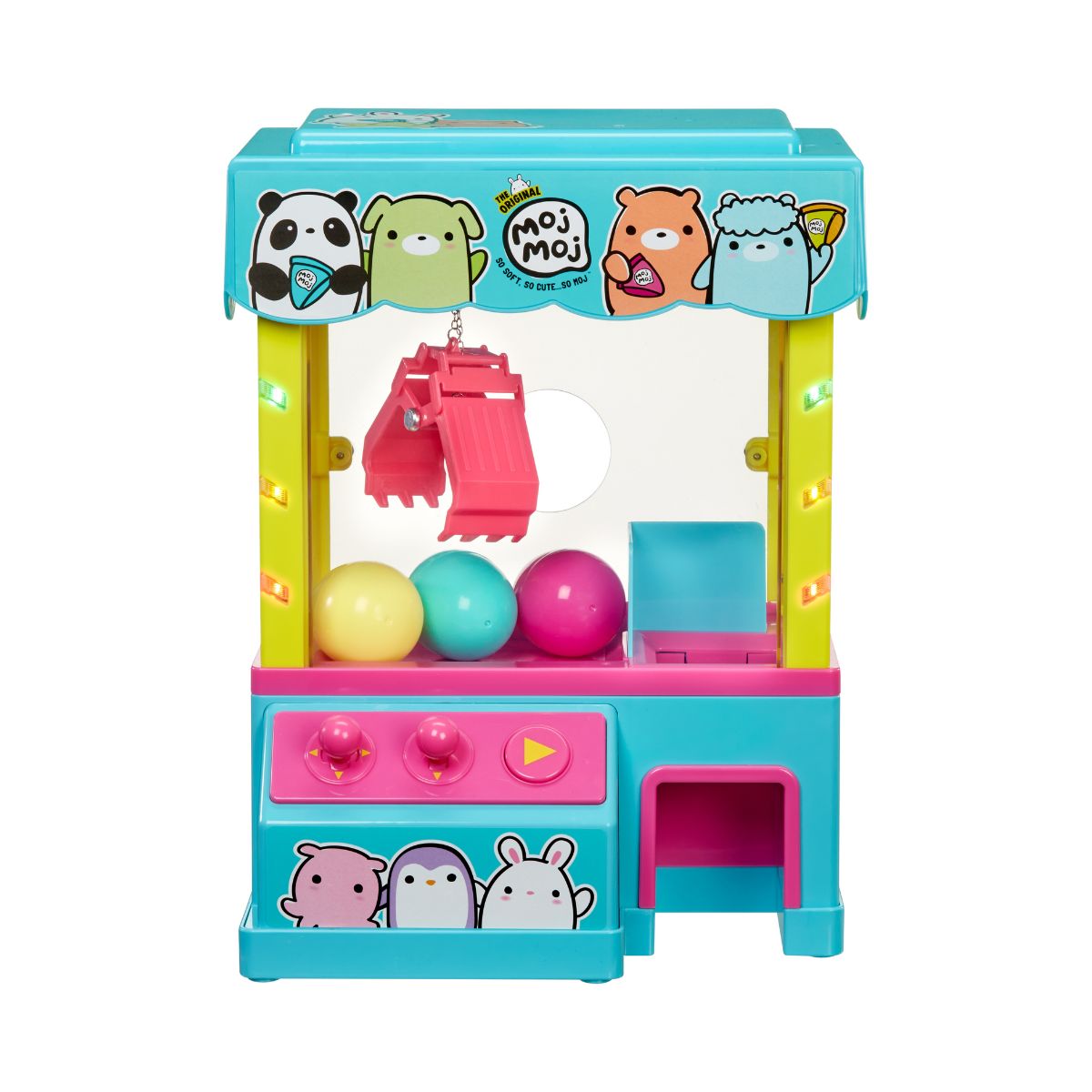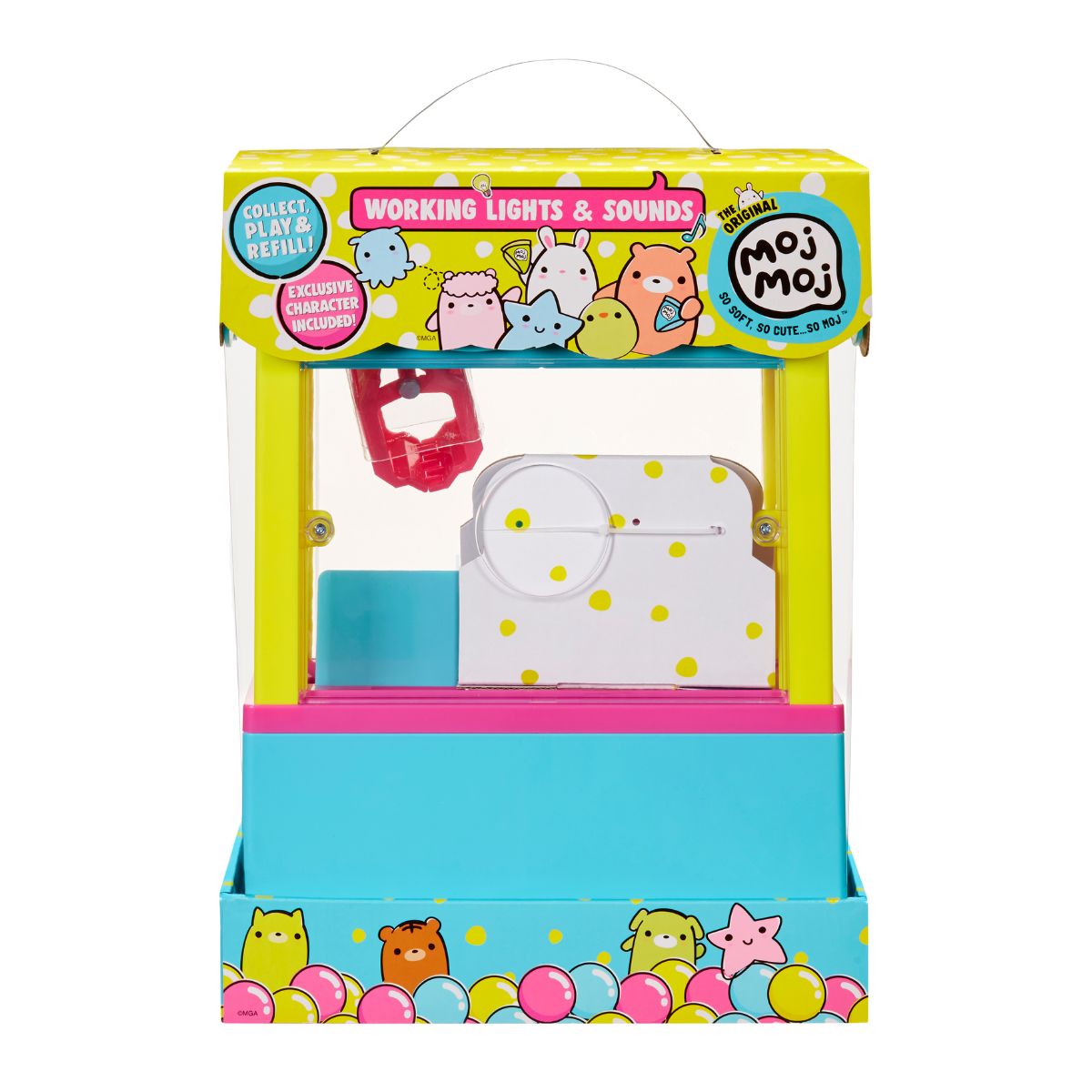 - Sau khi gắp được đồ chơi, đưa càng gắp về phía khe thả quà và thả xuống để lấy phần thưởng của bạn! Sản phẩm đi kèm một nhân vật Moj Moj Squish lấp lánh độc quyền! Ngoài ra, bạn cũng có thể sử dụng máy để trưng bày hoặc cất giữ bộ sưu tập Moj Moj yêu thích của mình. Bộ sản phẩm bao gồm: