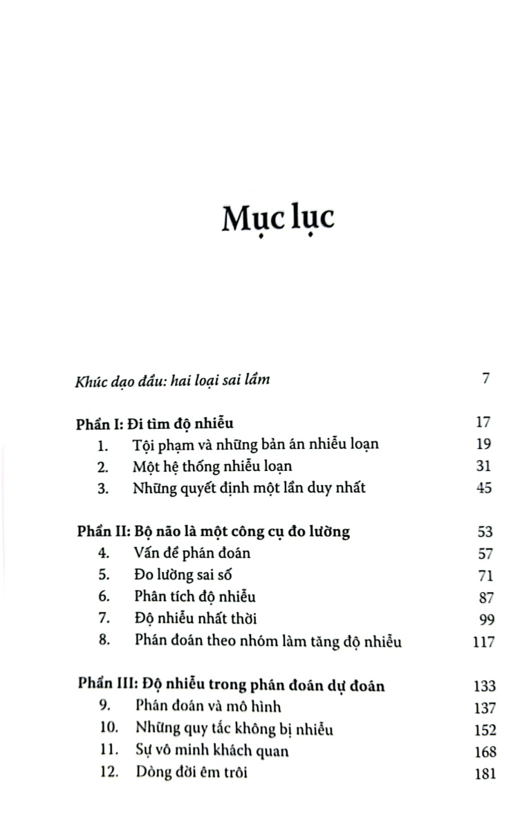 Daniel Kahneman, Olivier Sibony và Cass R. Sunstein cho thấy tác động bất lợi của độ nhiễu trong nhiều lĩnh vực, bao gồm y khoa, luật, dự báo kinh tế, khoa học pháp y, bảo lãnh tại ngoại, bảo vệ trẻ em, chiến lược, đánh giá hiệu suất, và lựa chọn nhân sự. Ở đâu có phán đoán, ở đó có độ nhiễu. Tuy nhiên, hầu hết các cá nhân và tổ chức đều không biết. Họ phớt lờ độ nhiễu. Với một vài biện pháp khắc phục đơn giản, mọi người có thể giảm nhiễu và định kiến, từ đó đưa ra những quyết định tốt hơn nhiều.