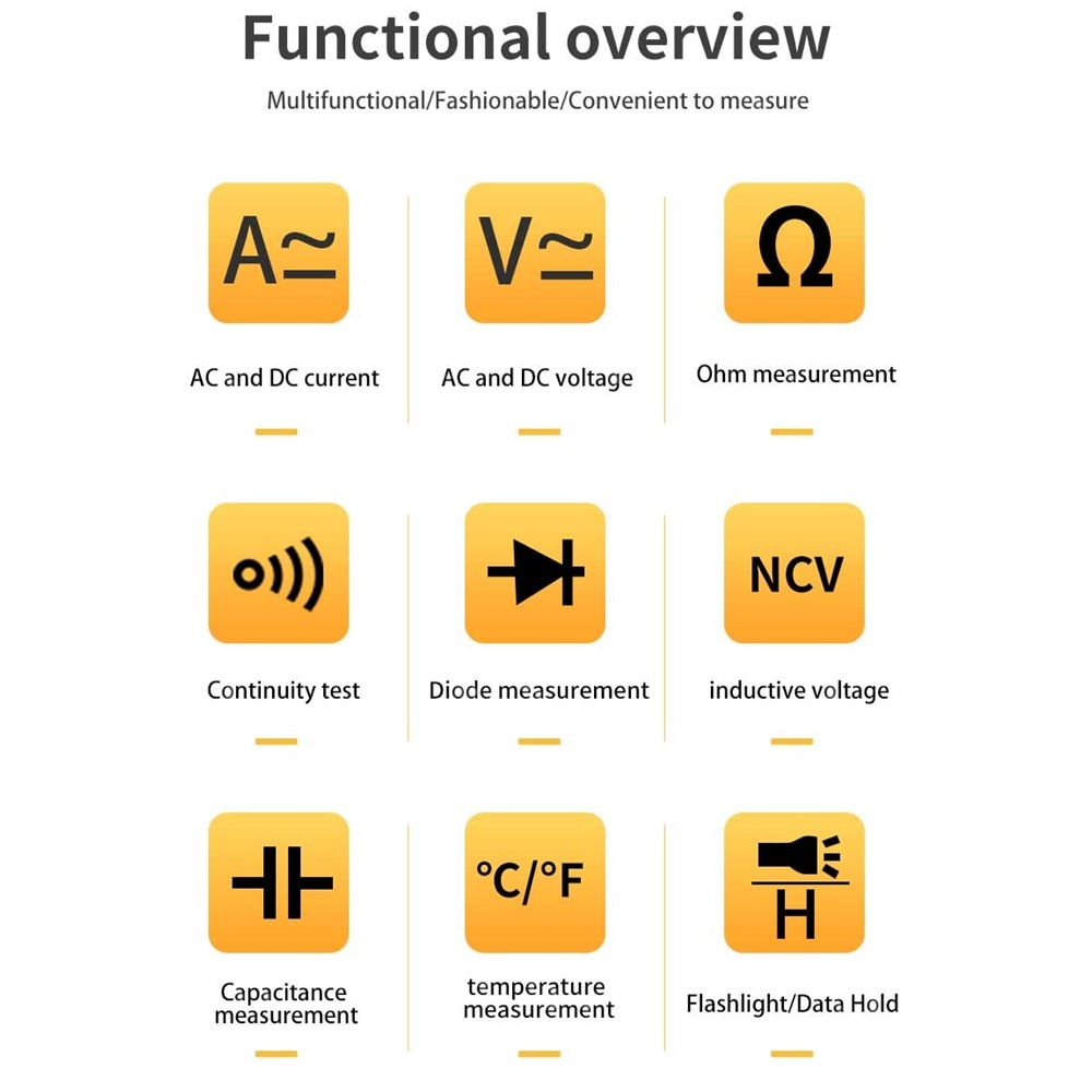Dễ sử dụng: thao tác bằng một tay, Với tính năng giữ dữ liệu và giữ đỉnh, Nhận dạng dây không/cháy, Tự động tắt khi không sử dụng đồng hồ trong 15 phút.