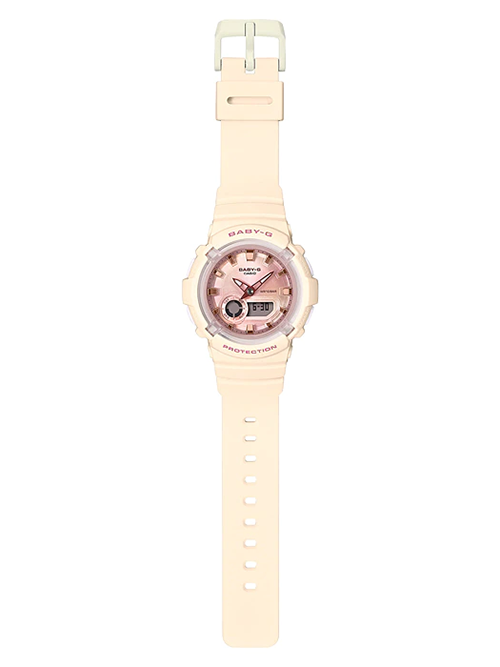 Thỏa mãn vị giác với mẫu đồng hồ BABY-G màu kẹo. Vỏ và dây đeo đẹp mắt phủ lớp hoàn thiện mờ kết hợp với đường gờ và vạch chỉ giờ bằng nhựa resin trong