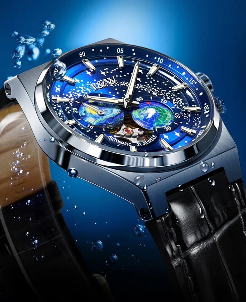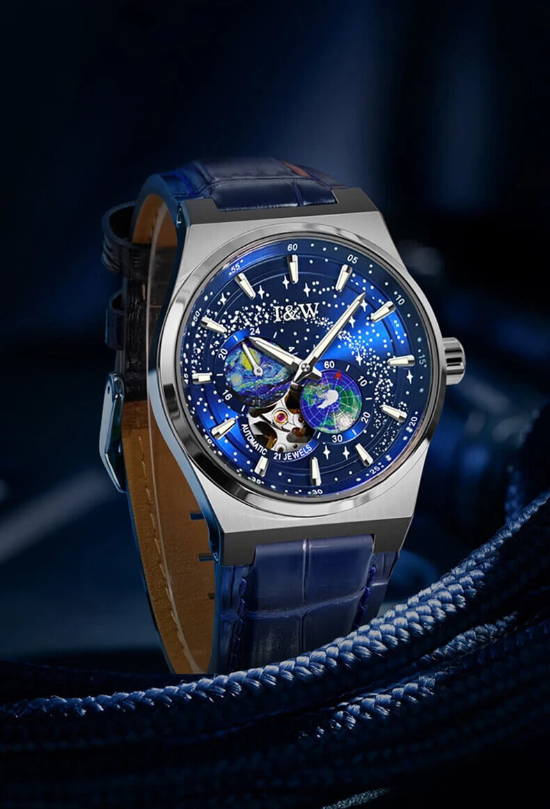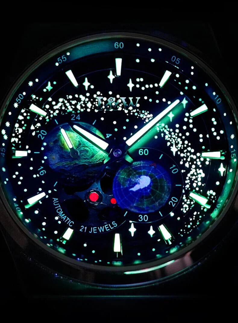 Sự kết hợp hoàn hảo đến khó tin của mặt dial vạn vì sao lấp lánh như bầu trời trong đêm cùng với sự sáng tạo kim giây mô phỏng vòng quay của Trái Đất không ngừng nghỉ (đặc sắc hơn với dạ quang siêu sáng ban đêm)