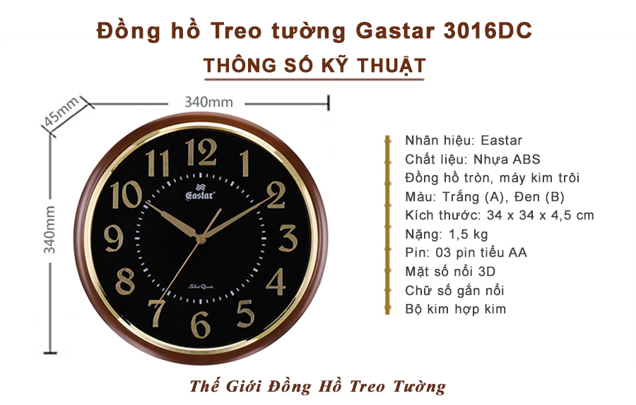 1. ĐẶC ĐIỂM NỔI BẬT: - Đồng hồ Treo tường Cao Cấp EASTAR có Dạ quang (*), máy đồng hồ Kim trôi mặt tròn Thương hiệu Gastar, đường kính 34 cm, dày 4,5 cm. -
